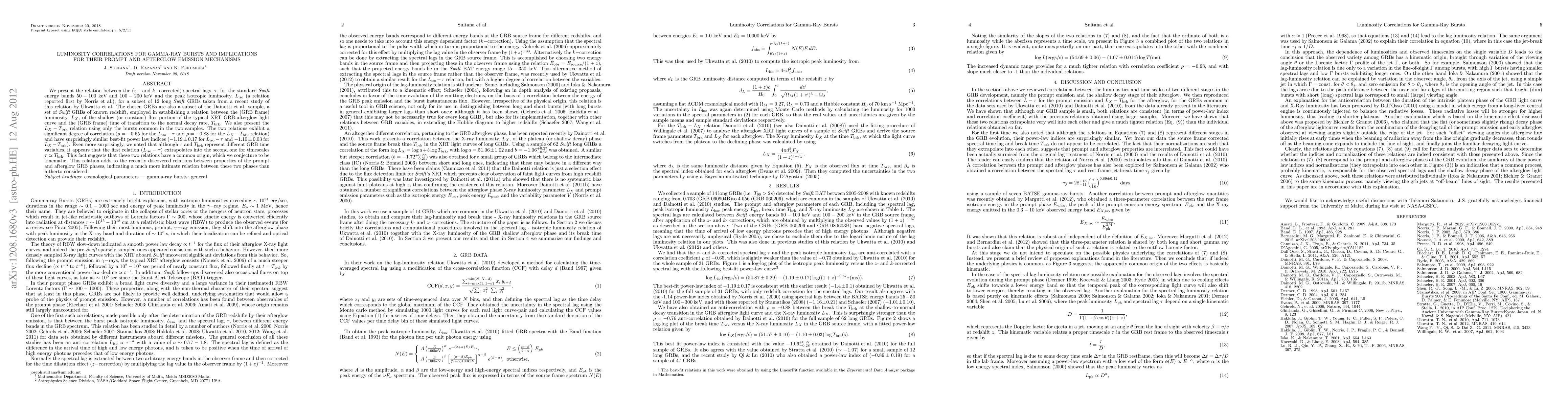 We present the relation between the ($z-$ and $k-$corrected) spectral lags, $\tau$, for the standard Swift energy bands 50-100 keV and 100-200 keV and the peak isotropic luminosity, $L_{\mathrm{iso}}$ (a relation reported first by Norris et al.), for a subset of 12 long Swift GRBs taken from a recent study of this relation by Ukwatta et al. The chosen GRBs are also a subset of the Dainotti et al. sample, a set of Swift GRBs of known redshift, employed in establishing a relation between the (GRB frame) luminosity, $L_X$, of the shallow (or constant) flux portion of the typical XRT GRB-afterglow light curve and the (GRB frame) time of transition to the normal decay rate, $T_{\mathrm{brk}}$. We also present the $L_X-T_{\mathrm{brk}}$ relation using only the bursts common in the two samples. The two relations exhibit a significant degree of correlation ($\rho = -0.65$ for the $L_{\mathrm{iso}}-\tau$ and $\rho = -0.88$ for the $L_{X} - T_{\mathrm{brk}}$ relation) and have surprisingly similar best-fit power law indices ($-1.19 \pm 0.17$ for $L_{\mathrm{iso}}-\tau$ and $-1.10 \pm 0.03$ for $L_{X} - T_{\mathrm{brk}}$). Even more surprisingly, we noted that although $\tau$ and $T_{\mathrm{brk}}$ represent different GRB time variables, it appears that the first relation ($L_{\mathrm{iso}}-\tau$) extrapolates into the second one for timescales $\tau \simeq T_{\mathrm{brk}}$. This fact suggests that these two relations have a common origin, which we conjecture to be kinematic. This relation adds to the recently discovered relations between properties of the prompt and afterglow GRB phases, indicating a much more intimate relation between these two phases than hitherto considered.