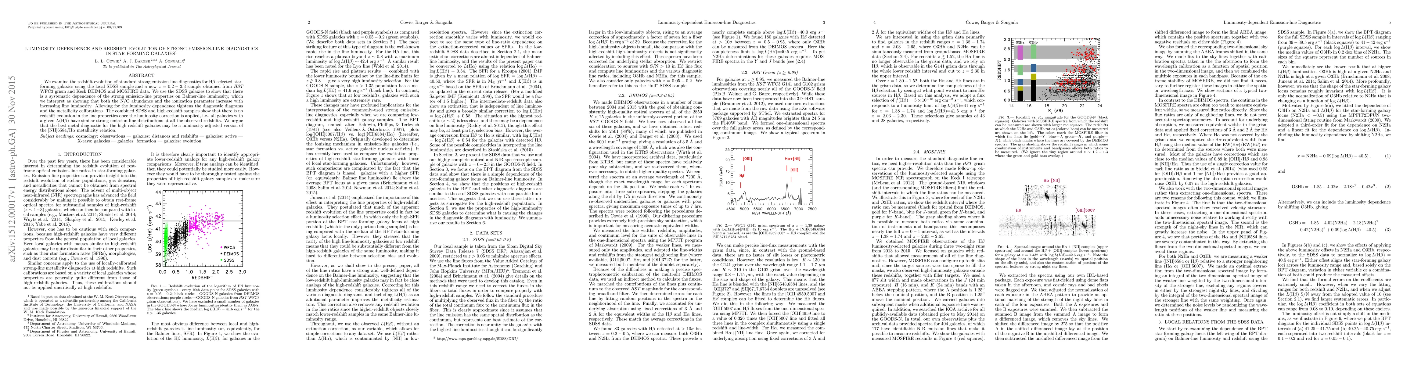 We examine the redshift evolution of standard strong emission-line diagnostics for Hbeta-selected star-forming galaxies using the local SDSS sample and a new z = 0.2 - 2.3 sample obtained from HST WFC3 grism and Keck DEIMOS and MOSFIRE data. We use the SDSS galaxies to show that there is a systematic dependence of the strong emission-line properties on Balmer-line luminosity, which we interpret as showing that both the N/O abundance and the ionization parameter increase with increasing line luminosity. Allowing for the luminosity dependence tightens the diagnostic diagrams and the metallicity calibrations. The combined SDSS and high-redshift samples show that there is no redshift evolution in the line properties once the luminosity correction is applied, i.e., all galaxies with a given L(Hbeta) have similar strong emission-line distributions at all the observed redshifts. We argue that the best metal diagnostic for the high-redshift galaxies may be a luminosity-adjusted version of the [NII]6584/Halpha metallicity relation.