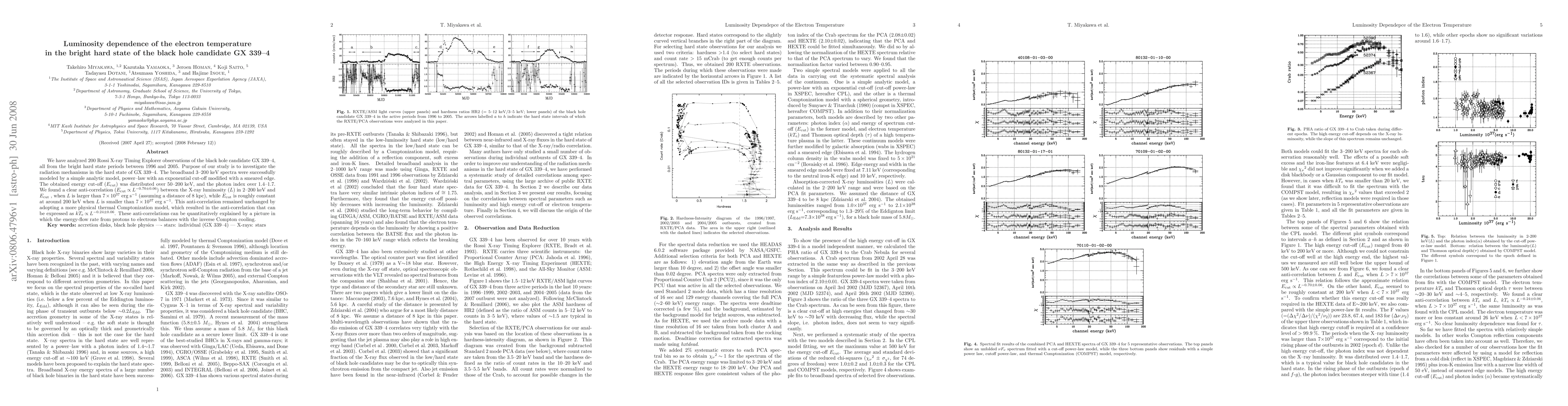 This study of GX 339--4, a black hole candidate, found an anti-correlation between X-ray luminosity and electron temperature in the bright hard state. The electron temperature, represented by energy cut-off (E_cut) or Compton temperature (kT_e), decreases as luminosity increases, suggesting a balance between energy flow from protons to electrons and inverse Compton cooling.
