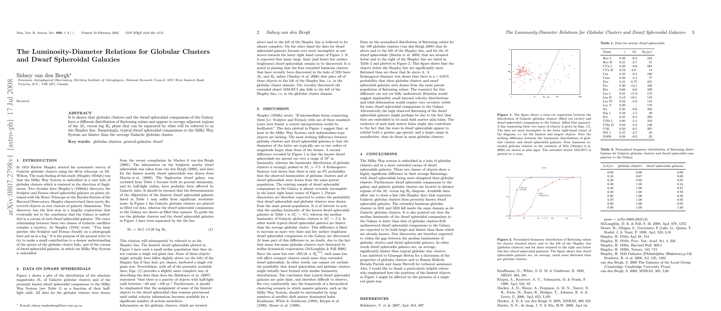 Summary: The study reveals distinct luminosity-diameter relations for globular clusters and dwarf spheroidal galaxies, with the latter occupying a separate region on the M_v versus log R_h plane, referred to as the Shapley line, and being generally fainter than typical Galactic globular clusters.