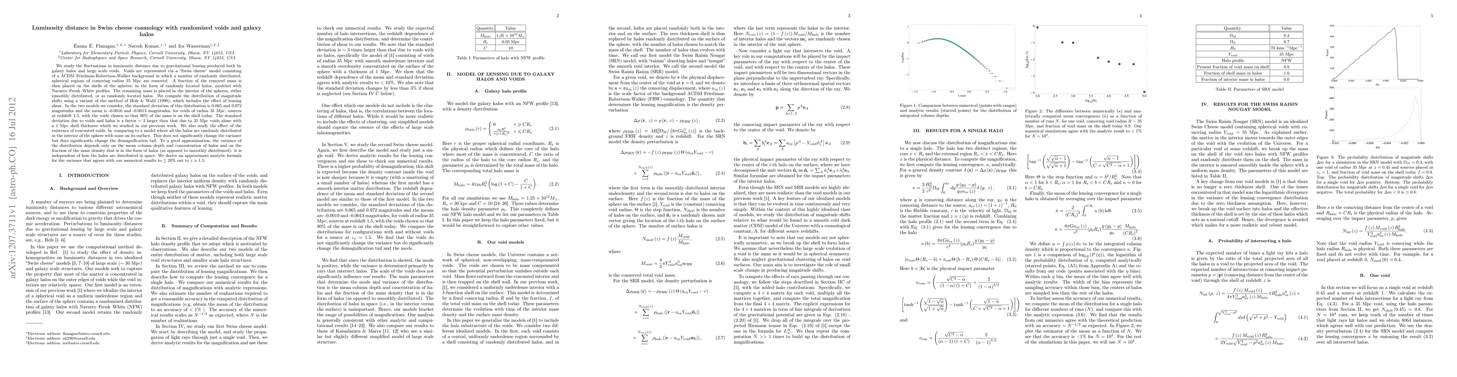 We study the fluctuations in luminosity distance due to gravitational lensing produced both by galaxy halos and large scale voids. Voids are represented via a "Swiss cheese" model consisting of a \LambdaCDM Friedman-Robertson-Walker background in which a number of randomly distributed, spherical regions of comoving radius 35 Mpc are removed. A fraction of the removed mass is then placed on the shells of the spheres, in the form of randomly located halos, modeled with Navarro-Frenk-White profiles. The remaining mass is placed in the interior of the spheres, either smoothly distributed, or as randomly located halos. We compute the distribution of magnitude shifts using a variant of the method of Holz & Wald (1998), which includes the effect of lensing shear. In the two models we consider, the standard deviation of this distribution is 0.065 and 0.072 magnitudes and the mean is -0.0010 and -0.0013 magnitudes, for voids of radius 35 Mpc, sources at redshift 1.5, with the voids chosen so that 90% of the mass is on the shell today. The standard deviation due to voids and halos is a factor ~ 3 larger than that due to 35 Mpc voids alone with a 1 Mpc shell thickness which we studied in our previous work. To a good approximation, the variance of the distribution depends only on the mean column depth and concentration of halos and on the fraction of the mass density that is in the form of halos (as opposed to smoothly distributed): it is independent of how the halos are distributed in space. We derive an approximate analytic formula for the variance that agrees with our numerical results to \lesssim 20% out to z\simeq 1.5.