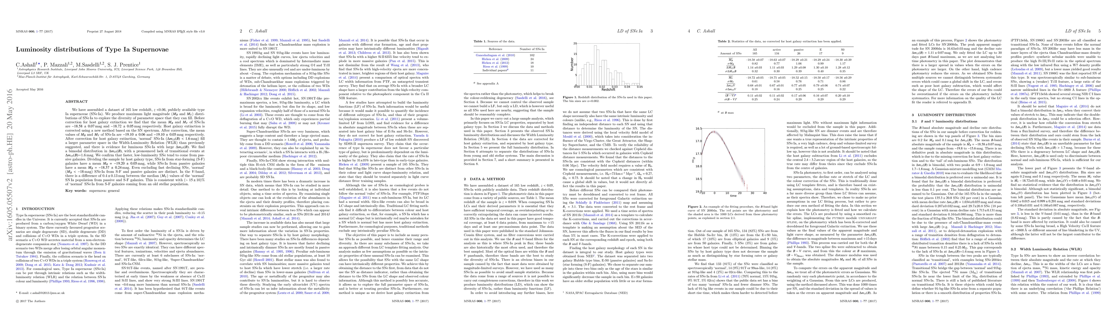 We have assembled a dataset of 165 low redshift, $z<$0.06, publicly available type Ia supernovae (SNe Ia). We produce maximum light magnitude ($M_{B}$ and $M_{V}$) distributions of SNe Ia to explore the diversity of parameter space that they can fill. Before correction for host galaxy extinction we find that the mean $M_{B}$ and $M_{V}$ of SNe Ia are $-18.58\pm0.07$mag and $-18.72\pm0.05$mag respectively. Host galaxy extinction is corrected using a new method based on the SN spectrum. After correction, the mean values of $M_{B}$ and $M_{V}$ of SNe Ia are $-19.10\pm0.06$ and $-19.10\pm0.05$mag respectively. After correction for host galaxy extinction, `normal' SNeIa ($\Delta m_{15}(B)<1.6$mag) fill a larger parameter space in the Width-Luminosity Relation (WLR) than previously suggested, and there is evidence for luminous SNe Ia with large $\Delta m_{15}(B)$. We find a bimodal distribution in $\Delta m_{15}(B)$, with a pronounced lack of transitional events at $\Delta m_{15}(B)$=1.6 mag. We confirm that faster, low-luminosity SNe tend to come from passive galaxies. Dividing the sample by host galaxy type, SNe Ia from star-forming (S-F) galaxies have a mean $M_{B}=-19.20 \pm 0.05$ mag, while SNe Ia from passive galaxies have a mean $M_{B}=-18.57 \pm 0.24$ mag. Even excluding fast declining SNe, `normal' ($M_{B}<-18$ mag) SNe Ia from S-F and passive galaxies are distinct. In the $V$-band, there is a difference of 0.4$ \pm $0.13 mag between the median ($M_{V}$) values of the `normal' SN Ia population from passive and S-F galaxies. This is consistent with ($\sim 15 \pm $10)% of `normal' SNe Ia from S-F galaxies coming from an old stellar population.