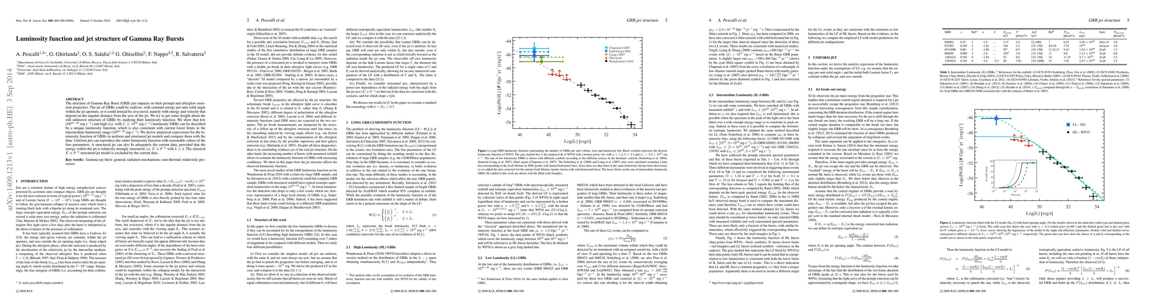 This paper investigates the luminosity function and jet structure of Gamma Ray Bursts (GRBs), finding that both low and high luminosity GRBs can be described by a unique luminosity function. Uniform jet models can reproduce the observed luminosity function, while structured jets require a strong angular dependence (E ∝ θ^(-k) with k > 4) to fit the data, excluding the classical E ∝ θ^(-2) model.