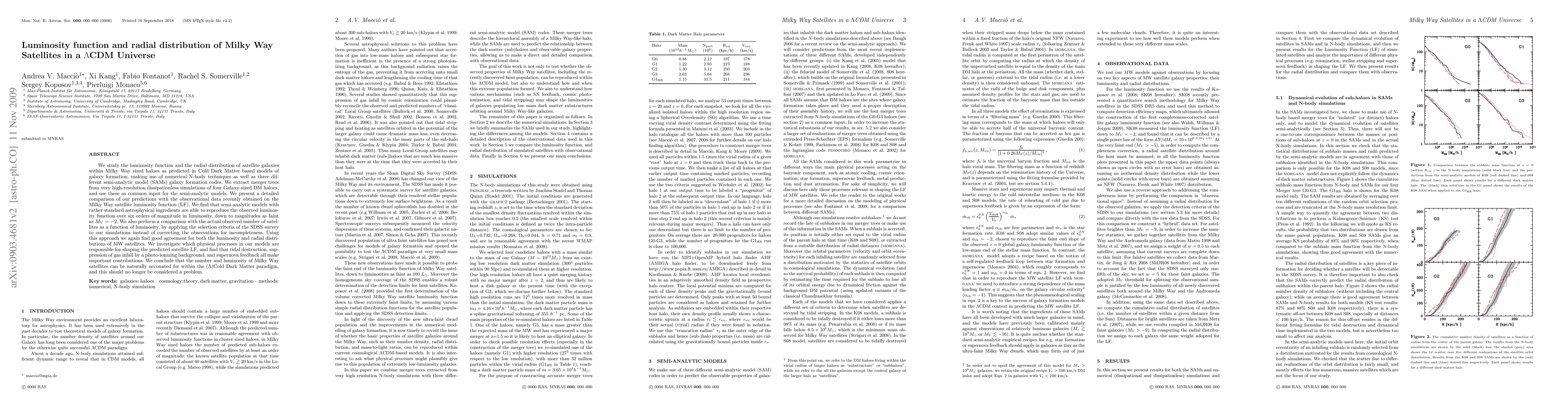 This paper investigates the luminosity function and radial distribution of Milky Way satellites using Cold Dark Matter models and semi-analytic models, comparing predictions with observational data. It finds good agreement and attributes the satellite luminosity function to tidal destruction, gas suppression, and supernova feedback.