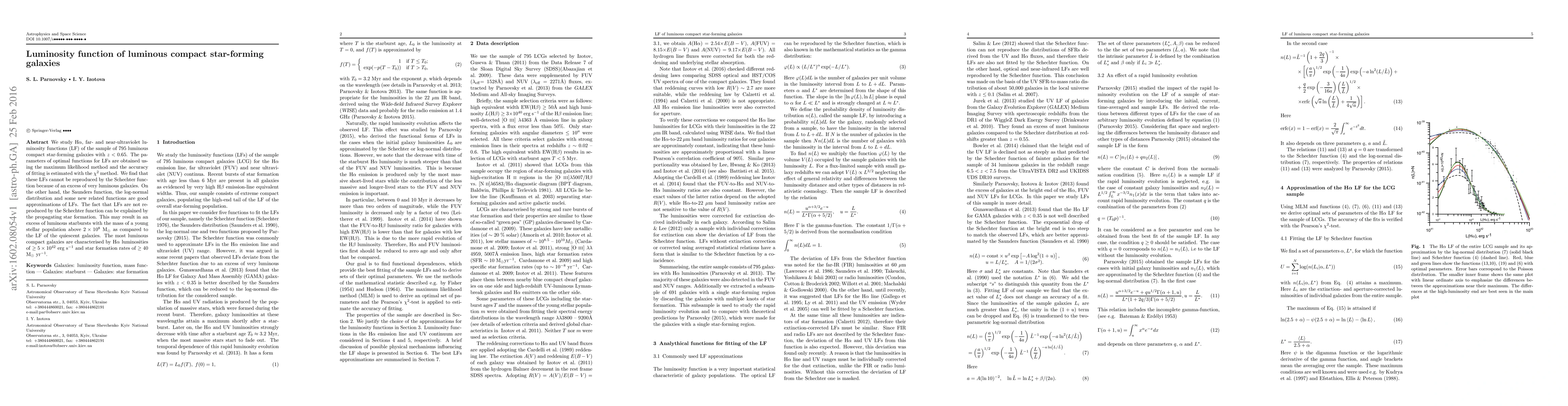 We study H-alpha, far- and near-ultraviolet luminosity functions (LF) of the sample of 795 luminous compact star-forming galaxies with z<0.65. The parameters of optimal functions for LFs are obtained using the maximum likelihood method and the accuracy of fitting is estimated with the chi-squared method. We find that these LFs cannot be reproduced by the Schechter function because of an excess of very luminous galaxies. On the other hand, the Saunders function, the log-normal distribution and some new related functions are good approximations of LFs. The fact that LFs are not reproduced by the Schechter function can be explained by the propagating star formation. This may result in an excess of luminous starbursts with the mass of a young stellar population above 2*10^8 M_Sun as compared to the LF of the quiescent galaxies. The most luminous compact galaxies are characterised by H-alpha luminosities of > 5*10^{42} erg/s and star formation rates of > 40 M_Sun/yr.