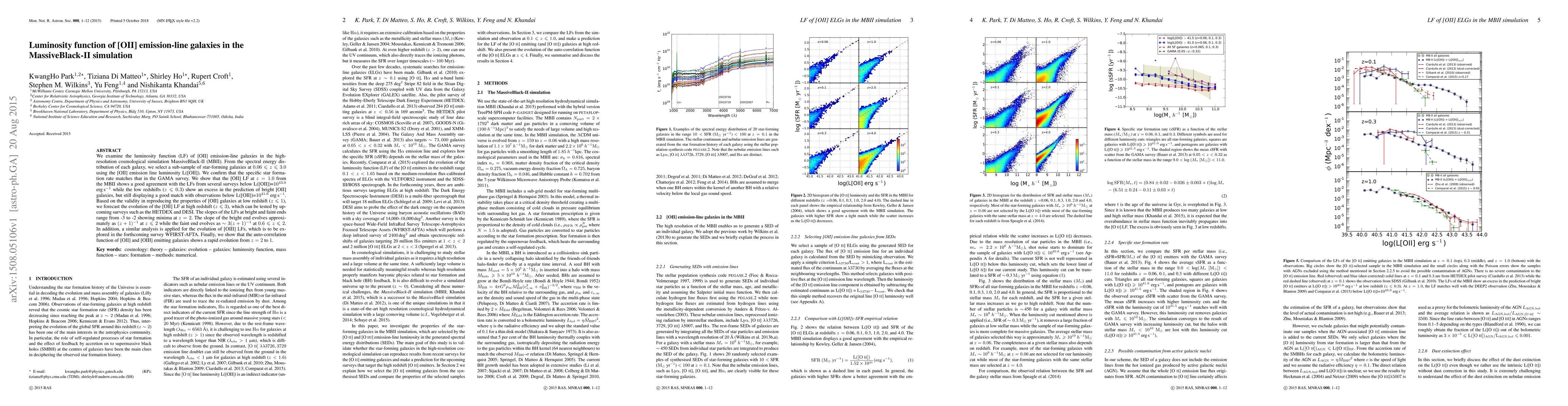 This paper investigates the luminosity function (LF) of [OII] emission-line galaxies in the MassiveBlack-II simulation, confirming agreement with observational data at low redshifts and forecasting high-redshift evolution. The study also explores the evolution of [OIII] LFs and the rapid evolution of the auto-correlation function of these galaxies.