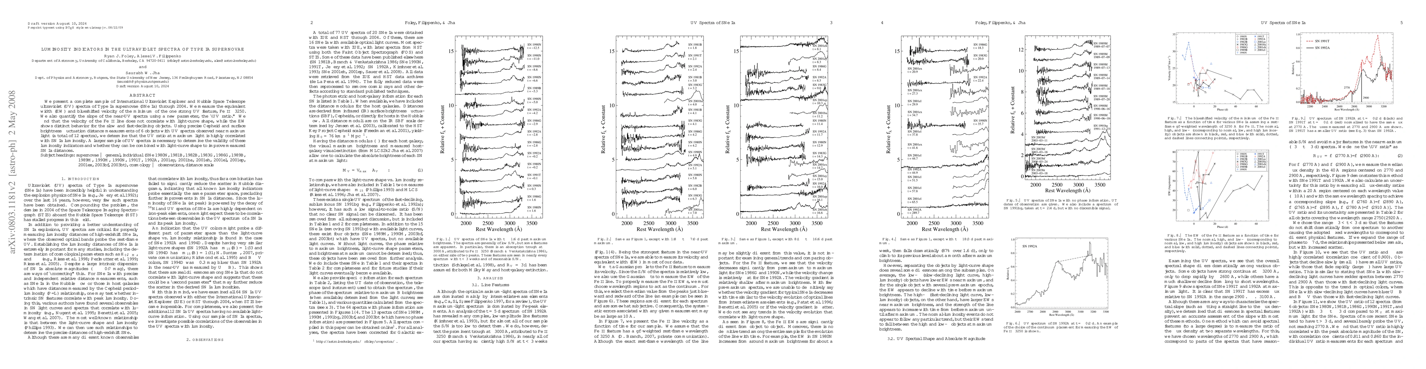 This paper analyzes UV spectra of Type Ia supernovae, finding that the UV ratio correlates strongly with SN Ia luminosity, while the Fe II line's velocity does not. The study suggests that a larger sample is needed to confirm these UV luminosity indicators and their potential to refine distance measurements.