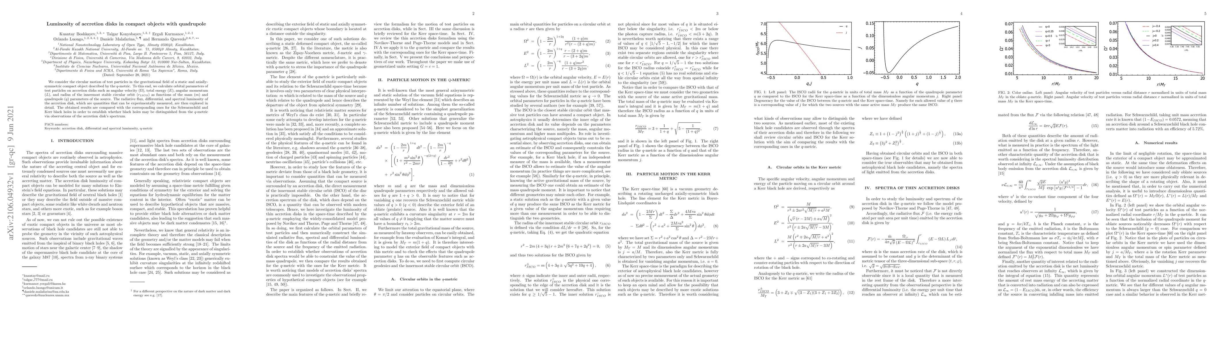 This study explores the luminosity of accretion disks in compact objects with quadrupole, calculating key parameters like angular velocity and radius of the innermost stable circular orbit as functions of mass and quadrupole parameters.