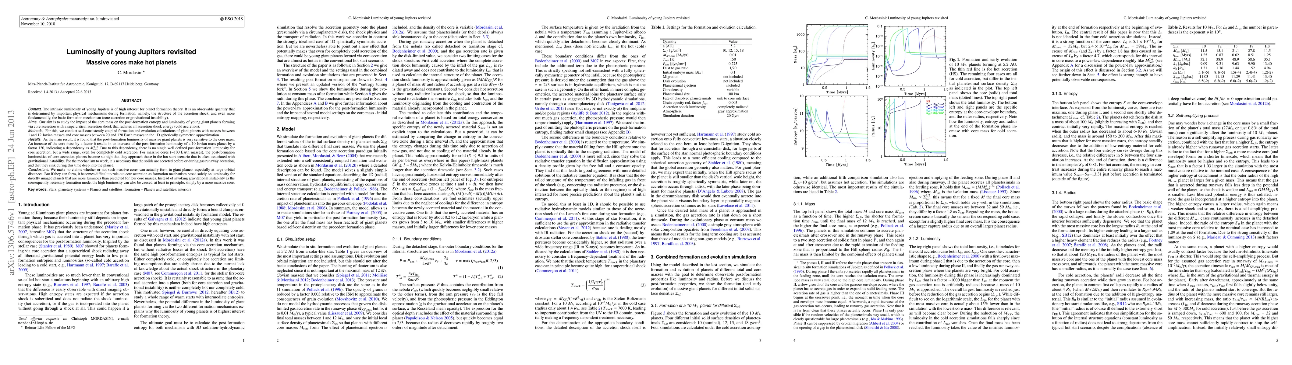 The intrinsic luminosity of young Jupiters is of high interest for planet formation theory. It is an observable quantity that is determined by important physical mechanisms during formation, namely the accretion shock structure, and even more fundamentally, the basic formation mechanism (core accretion or gravitational instability). We study the impact of the core mass on the post-formation entropy and luminosity of young giant planets forming via core accretion with a supercritical shock (cold accretion). For this, we conduct self-consistently coupled formation and evolution calculations of giant planets with masses between 1 and 12 Jovian masses and core masses between 20 and 120 Earth masses. We find that the post-formation luminosity of massive giant planets is very sensitive to the core mass. An increase of the core mass by a factor 6 results in an increase of the post-formation luminosity of a 10 Jovian mass planet by a factor 120. Due to this dependency, there is no single well defined post-formation luminosity for core accretion, but a wide range. For massive cores (~100 Earth masses), the post-formation luminosities of core accretion planets become so high that they approach those in the hot start scenario that is often associated with gravitational instability. For the mechanism to work, it is necessary that the solids are accreted before or during gas runaway accretion, and that they sink deep into the planet. We make no claims whether or not such massive cores can actually form in giant planets. But if yes, it becomes difficult to rule out core accretion as formation mechanism based solely on luminosity for directly imaged planets that are more luminous than predicted for low core masses. Instead of invoking gravitational instability as the consequently necessary formation mode, the high luminosity could also be caused simply by a more massive core.