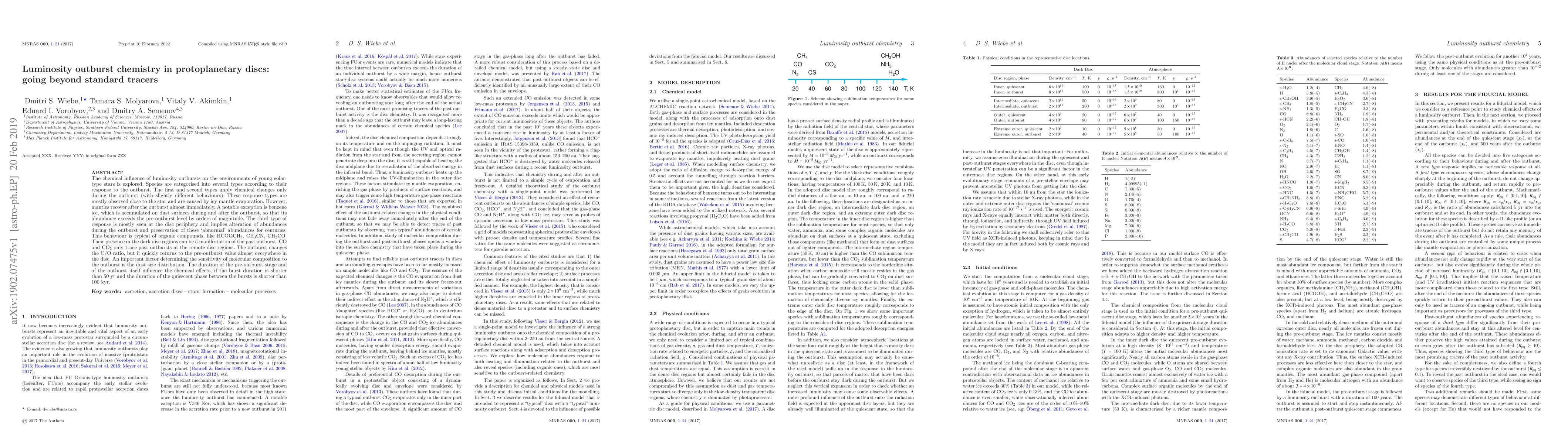 The chemical influence of luminosity outbursts on the environments of young solar-type stars is explored. Species are categorised into several types according to their response to the outburst. The first and second types imply chemical changes only during the outburst (with slightly different behaviours). These response types are mostly observed close to the star and are caused by icy mantle evaporation. However, mantles recover after the outburst almost immediately. A notable exception is benzene ice, which is accumulated on dust surfaces during and after the outburst, so that its abundance exceeds the pre-outburst level by orders of magnitude. The third type of response is mostly seen at the disc periphery and implies alteration of abundances during the outburst and preservation of these `abnormal' abundances for centuries. This behaviour is typical of organic compounds, like HCOOCH$_3$, CH$_3$CN, CH$_2$CO. Their presence in the dark disc regions can be a manifestation of the past outburst. CO and CO$_2$ only trace past outbursts at the remote disc regions. The outburst changes the C/O ratio, but it quickly returns to the pre-outburst value almost everywhere in the disc. An important factor determining the sensitivity of molecular composition to the outburst is the dust size distribution. The duration of the pre-outburst stage and of the outburst itself influence the chemical effects, if the burst duration is shorter than 50 yr and the duration of the quiescent phase between the bursts is shorter than 100 kyr.