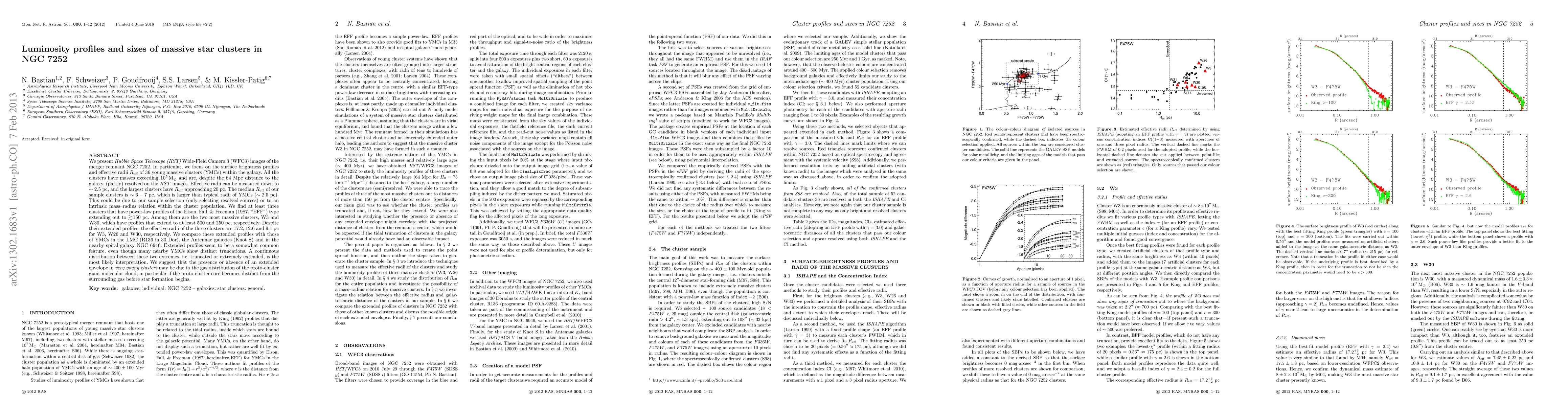 Researchers studied 36 massive star clusters in NGC 7252, finding that some have extremely extended profiles extending over 500 pc, while others have more typical sizes of ~6-7 pc, suggesting a possible mass-radius relation.