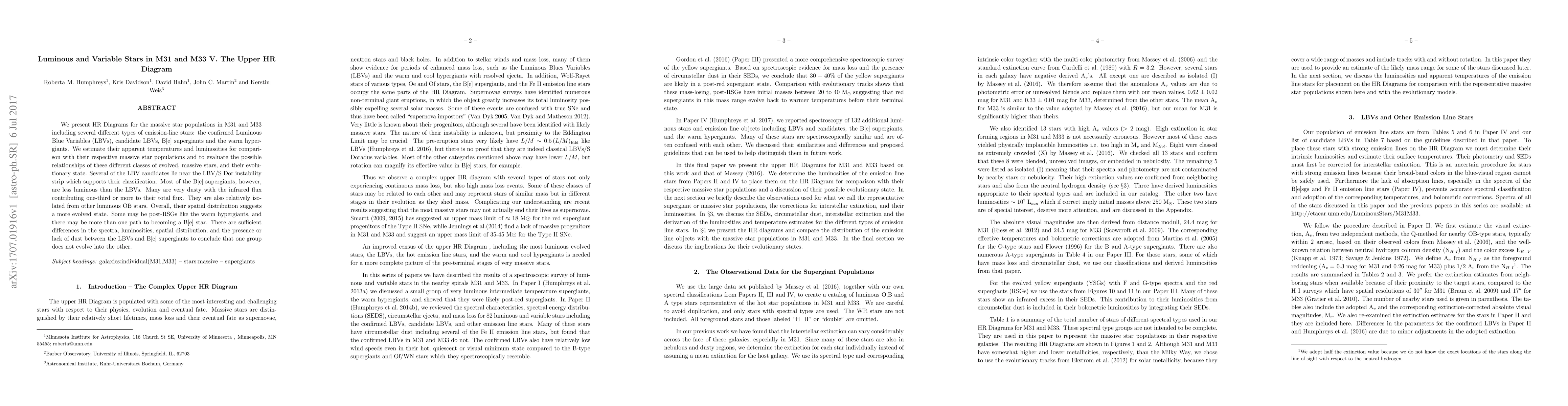 The study presents HR diagrams for massive star populations in M31 and M33, identifying distinct types of luminous stars, including LBVs, B[e] supergiants, and warm hypergiants, which indicate different evolutionary paths.