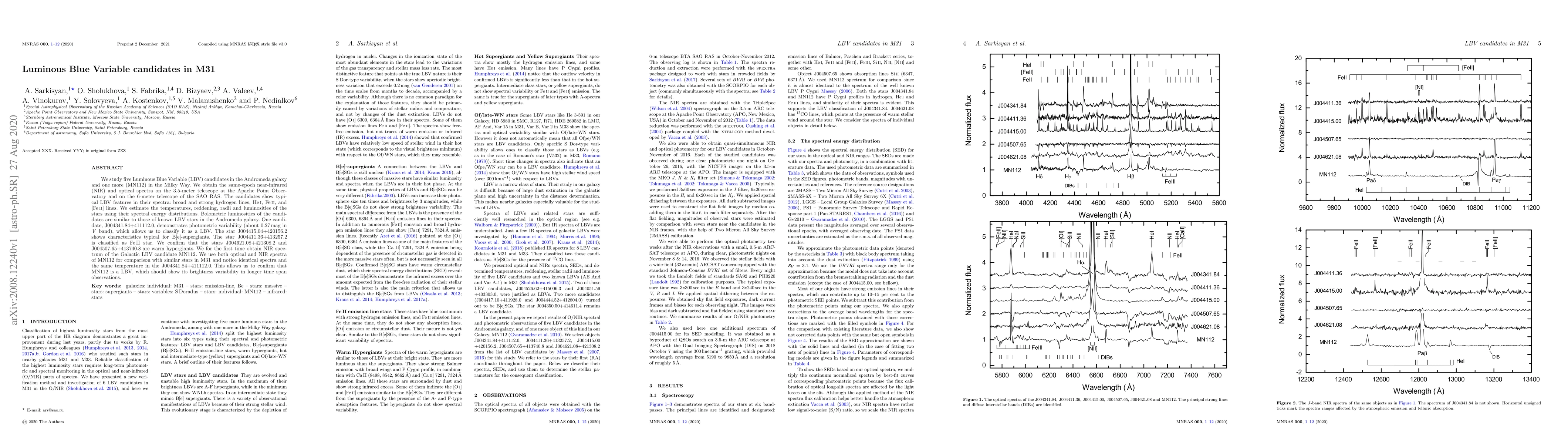 We study five Luminous Blue Variable (LBV) candidates in the Andromeda galaxy and one more (MN112) in the Milky Way. We obtain the same-epoch near-infrared (NIR) and optical spectra on the 3.5-meter telescope at the Apache Point Observatory and on the 6-meter telescope of the SAO RAS. The candidates show typical LBV features in their spectra: broad and strong hydrogen lines, HeI, FeII, and [FeII] lines. We estimate the temperatures, reddening, radii and luminosities of the stars using their spectral energy distributions. Bolometric luminosities of the candidates are similar to those of known LBV stars in the Andromeda galaxy. One candidate, J004341.84+411112.0, demonstrates photometric variability (about 0.27 mag in V band), which allows us to classify it as a LBV. The star J004415.04+420156.2 shows characteristics typical for B[e]-supergiants. The star J004411.36+413257.2 is classified as FeII star. We confirm that the stars J004621.08+421308.2 and J004507.65+413740.8 are warm hypergiants. We for the first time obtain NIR spectrum of the Galactic LBV candidate MN112. We use both optical and NIR spectra of MN112 for comparison with similar stars in M31 and notice identical spectra and the same temperature in the J004341.84+411112.0. This allows us to confirm that MN112 is a LBV, which should show its brightness variability in longer time span observations.
