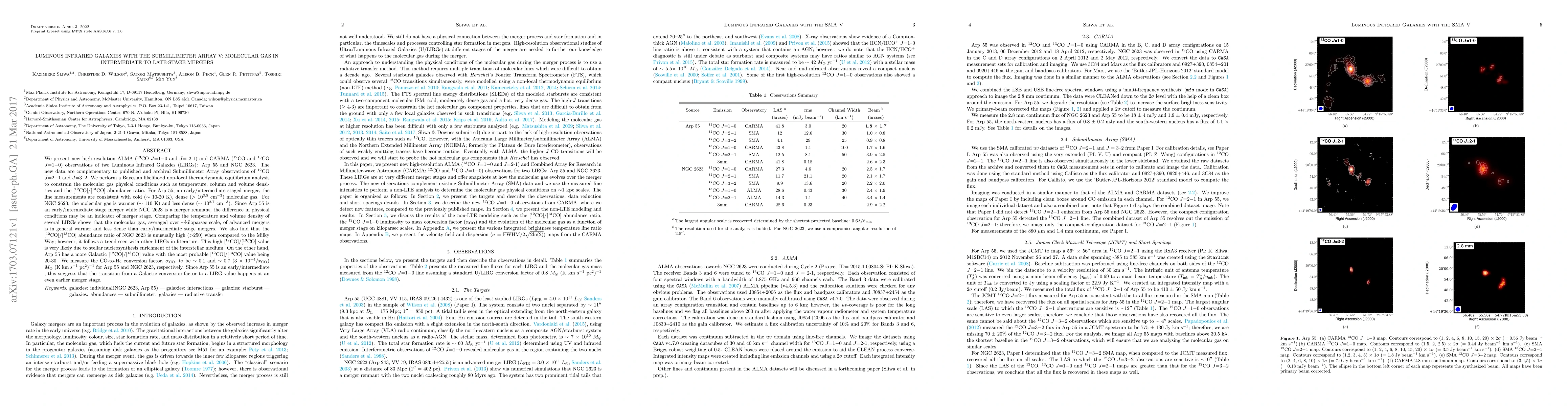 We present new high-resolution ALMA (13CO J=1-0 and J= 2-1) and CARMA (12CO and 13CO J=1-0) observations of two Luminous Infrared Galaxies (LIRGs): Arp 55 and NGC 2623. The new data are complementary to published and archival Submillimeter Array observations of 12CO J=2-1 and J=3-2. We perform a Bayesian likelihood non-local thermodynamic equilibrium analysis to constrain the molecular gas physical conditions such as temperature, column and volume densities and the [12CO]/[13CO] abundance ratio. For Arp 55, an early/intermediate staged merger, the line measurements are consistent with cold (~10-20 K), dense (>10$^{3.5}$ cm$^{-3}$) molecular gas. For NGC 2623, the molecular gas is warmer (~110 K) and less dense (~10$^{2.7}$ cm$^{-3}$). Since Arp 55 is an early/intermediate stage merger while NGC 2623 is a merger remnant, the difference in physical conditions may be an indicator of merger stage. Comparing the temperature and volume density of several LIRGs shows that the molecular gas, averaged over ~kpc scale, of advanced mergers is in general warmer and less dense than early/intermediate stage mergers. We also find that the [12CO]/[13CO] abundance ratio of NGC 2623 is unusually high (>250) when compared to the Milky Way; however, it follows a trend seen with other LIRGs in literature. This high [12CO]/[13CO] value is very likely due to stellar nucleosynthesis enrichment of the interstellar medium. On the other hand, Arp 55 has a more Galactic [12CO]/[13CO] value with the most probable [12CO]/[13CO] value being 20-30. We measure the CO-to-H2 conversion factor, $\alpha_{CO}$, to be ~0.1 and ~0.7 (3x10$^{-4}$/x$_{CO}$) M$_{\odot}$ (K km s$^{-1}$ pc$^{2}$)$^{-1}$ for Arp 55 and NGC 2623, respectively. Since Arp 55 is an early/intermediate , this suggests that the transition from a Galactic conversion factor to a LIRG value happens at an even earlier merger stage.