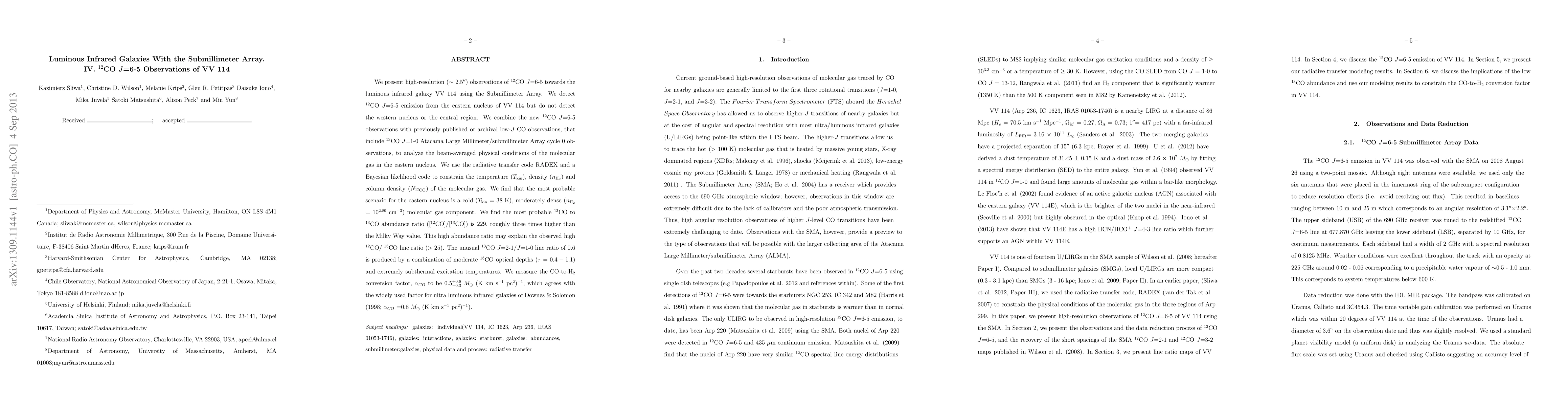 Researchers used the Submillimeter Array to observe 12CO J=6-5 emissions in the eastern nucleus of VV 114, a luminous infrared galaxy, finding a cold molecular gas component with a high 12CO to 13CO abundance ratio.