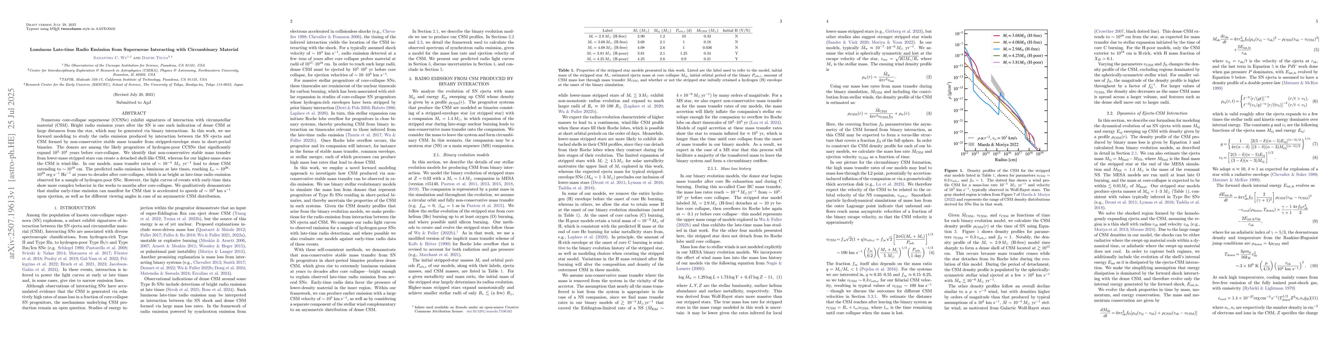 Numerous core-collapse supernovae (CCSNe) exhibit signatures of interaction with circumstellar material (CSM). Bright radio emission years after the SN is one such indication of dense CSM at large distances from the star, which may be generated via binary interactions. In this work, we use forward modeling to study the radio emission produced by interaction between the SN ejecta and CSM formed by non-conservative stable mass transfer from stripped-envelope stars in short-period binaries. The donors are among the likely progenitors of hydrogen-poor CCSNe that significantly expand $10^3$-$10^4$ years before core-collapse. We identify that non-conservative stable mass transfer from lower-mass stripped stars can create a detached shell-like CSM, whereas for our higher-mass stars the CSM is wind-like. In our models, mass transfer rates of $\sim 10^{-4} M_\odot$ $\mathrm{yr}^{-1}$ lead to dense CSM extending to $\sim 10^{18}$ $\mathrm{cm}$. The predicted radio emission is luminous at late times, reaching $L_{\nu}\sim10^{26}$-$10^{29}$ $\mathrm{erg}$ $\mathrm{s}^{-1}$ $\mathrm{Hz}^{-1}$ at years to decades after core-collapse, which is as bright as late-time radio emission observed for a sample of hydrogen-poor SNe. However, the light curves of events with early-time data show more complex behavior in the weeks to months after core-collapse. We qualitatively demonstrate that similar early-time emission can manifest for CSM that is accelerated to speeds of $\sim10^3$ $\mathrm{km}$ $\mathrm{s}^{-1}$ upon ejection, as well as for different viewing angles in case of an asymmetric CSM distribution.