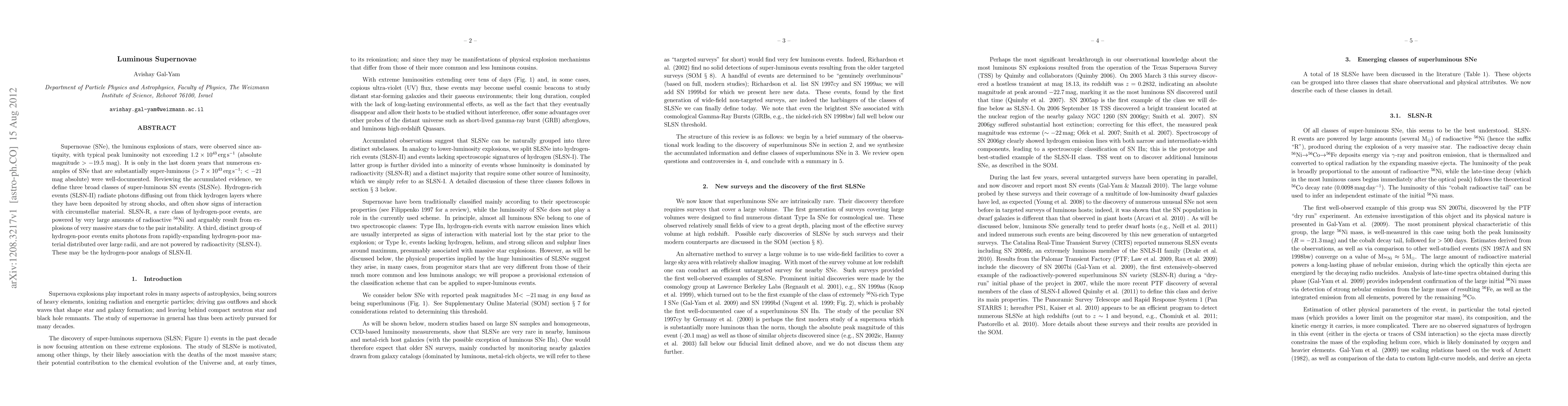 This paper categorizes super-luminous supernovae (SLSNe) into three types: SLSN-II, which are hydrogen-rich and powered by shock-deposited photons; SLSN-R, rare hydrogen-poor events driven by large amounts of radioactive 56Ni; and SLSN-I, hydrogen-poor events expanding rapidly without radioactivity.