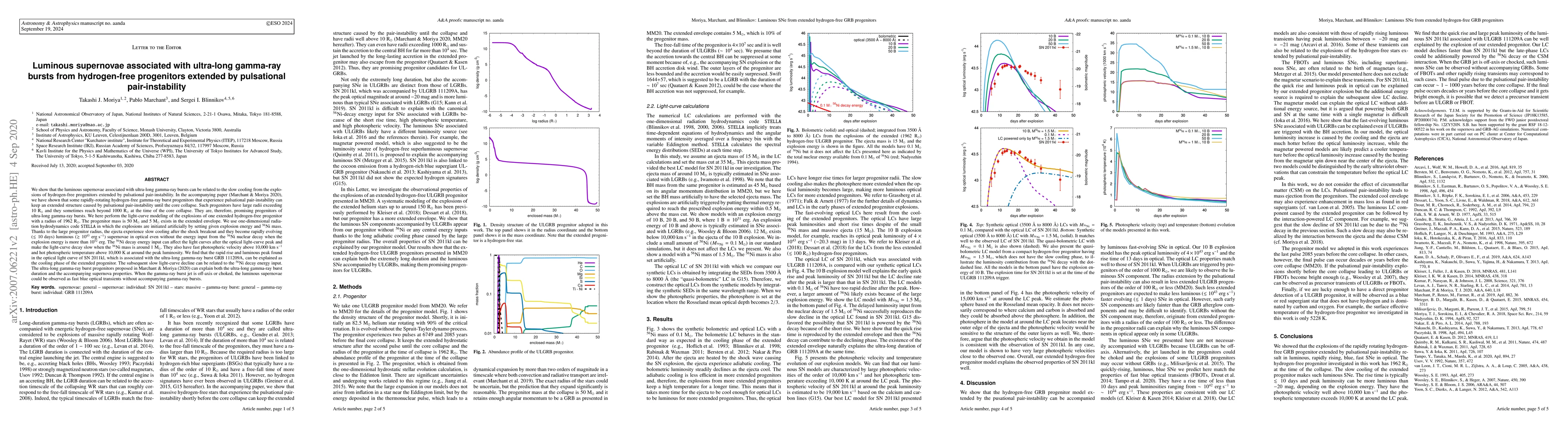 This paper demonstrates that luminous supernovae linked to ultra-long gamma-ray bursts originate from hydrogen-free progenitors extended by pulsational pair-instability, resulting in slow cooling and rapid evolution. The modeling of a progenitor with a radius of 1962 Rsun shows that such large radii lead to luminous supernovae without reliance on 56Ni decay energy, explaining the optical transient SN 2011kl.