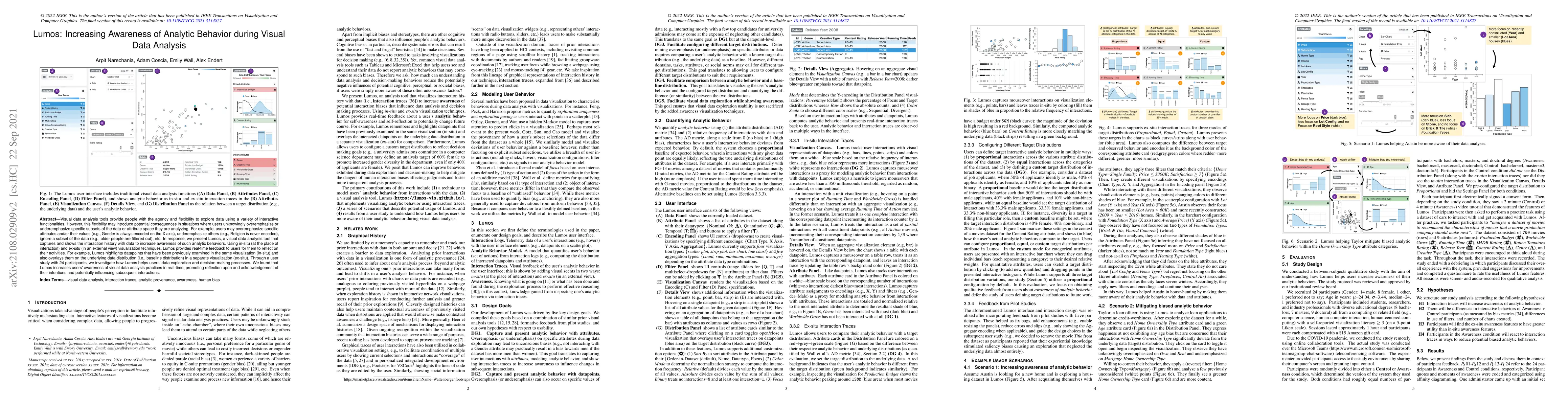 Visual data analysis tools provide people with the agency and flexibility to explore data using a variety of interactive functionalities. However, this flexibility may introduce potential consequences in situations where users unknowingly overemphasize or underemphasize specific subsets of the data or attribute space they are analyzing. For example, users may overemphasize specific attributes and/or their values (e.g., Gender is always encoded on the X axis), underemphasize others (e.g., Religion is never encoded), ignore a subset of the data (e.g., older people are filtered out), etc. In response, we present Lumos, a visual data analysis tool that captures and shows the interaction history with data to increase awareness of such analytic behaviors. Using in-situ (at the place of interaction) and ex-situ (in an external view) visualization techniques, Lumos provides real-time feedback to users for them to reflect on their activities. For example, Lumos highlights datapoints that have been previously examined in the same visualization (in-situ) and also overlays them on the underlying data distribution (i.e., baseline distribution) in a separate visualization (ex-situ). Through a user study with 24 participants, we investigate how Lumos helps users' data exploration and decision-making processes. We found that Lumos increases users' awareness of visual data analysis practices in real-time, promoting reflection upon and acknowledgement of their intentions and potentially influencing subsequent interactions.