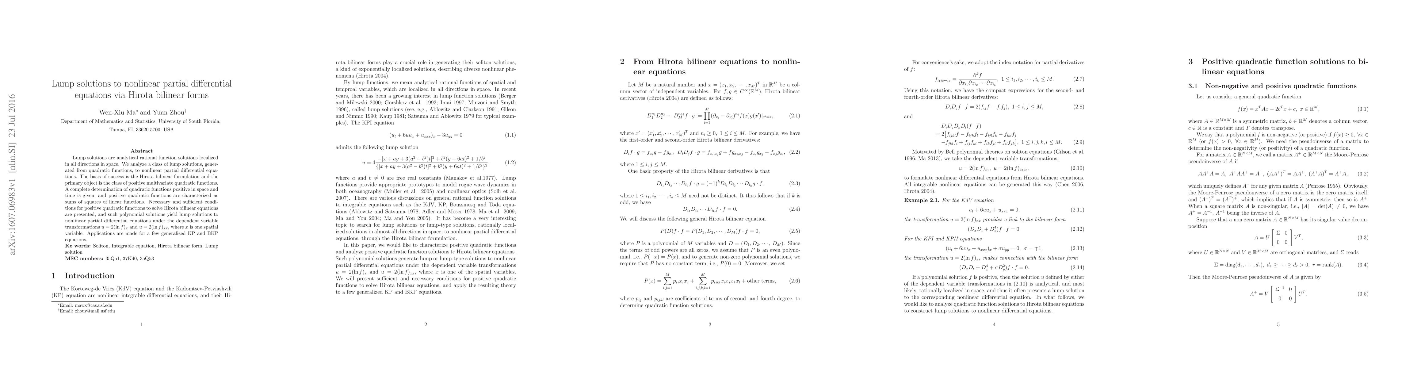 This paper investigates lump solutions—analytical rational functions localized in all spatial directions—to nonlinear partial differential equations using Hirota's bilinear method. It characterizes positive multivariate quadratic functions as sums of squares of linear functions and presents conditions for these functions to solve Hirota bilinear equations, yielding lump solutions for generalized KP and BKP equations.