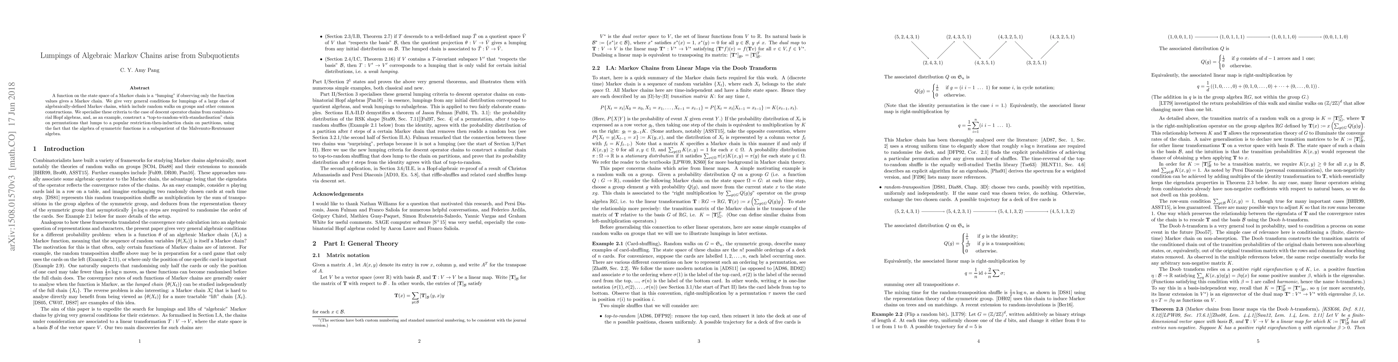 This paper provides general conditions for lumpings in algebraic Markov chains, including random walks on groups. It applies these criteria to descent operator chains from combinatorial Hopf algebras, constructing a specific "top-to-random-with-standardisation" chain on permutations that relates to a popular restriction-then-induction chain on partitions via the subquotient structure of the algebra of symmetric functions.
