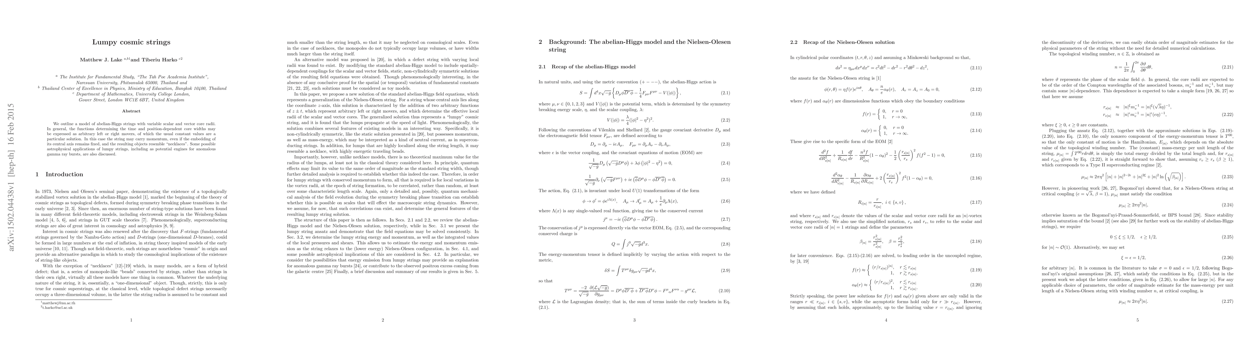 We outline a model of abelian-Higgs strings with variable scalar and vector core radii. In general, the functions determining the time and position-dependent core widths may be expressed as arbitrary left or right movers, of which the usual constant values are a particular solution. In this case the string may carry momentum, even if the embedding of its central axis remains fixed, and the resulting objects resemble "necklaces". Some possible astrophysical applications of lumpy strings, including as potential engines for anomalous gamma ray bursts, are also discussed.