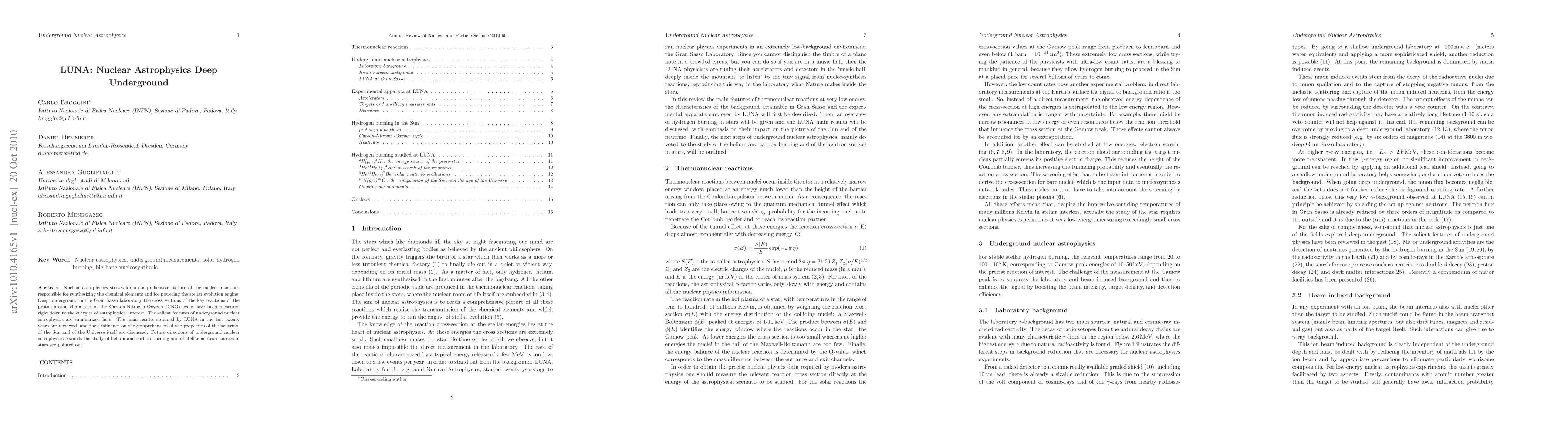 The LUNA project at Gran Sasso has measured key nuclear reaction cross sections for the proton-proton chain and CNO cycle deep underground, significantly advancing our understanding of stellar nucleosynthesis and the Sun's properties. Future research aims to explore helium and carbon burning processes and stellar neutron sources.