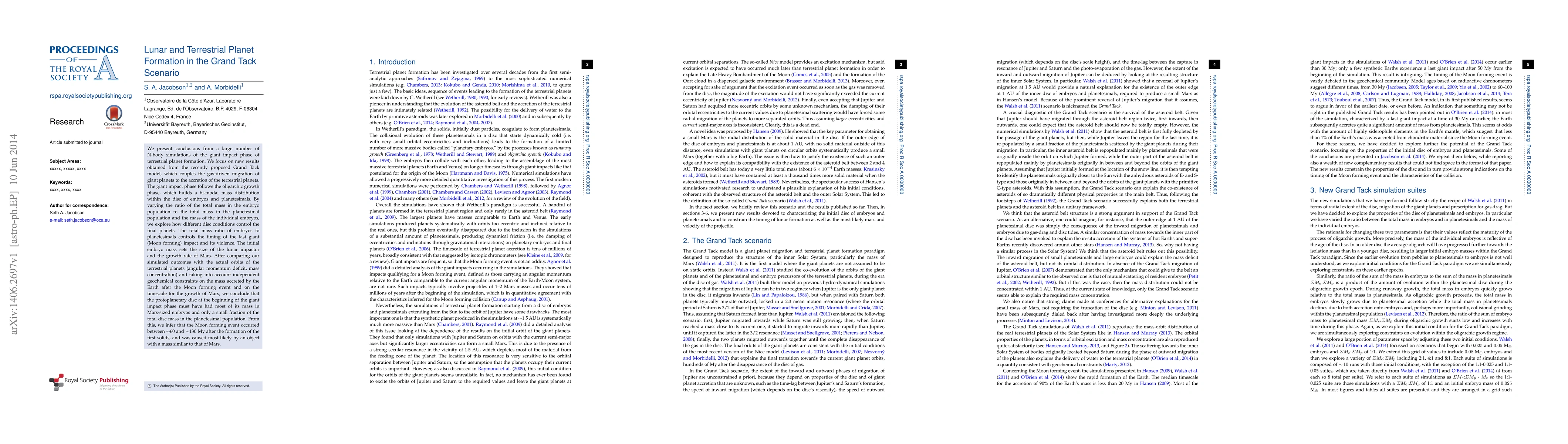 This paper uses N-body simulations to explore the Grand Tack model of terrestrial planet formation, finding that the Moon-forming impact likely occurred 60-130 million years after the first solids formed, driven by a Mars-sized object. The simulations suggest the protoplanetary disc had a majority of its mass in Mars-sized embryos.
