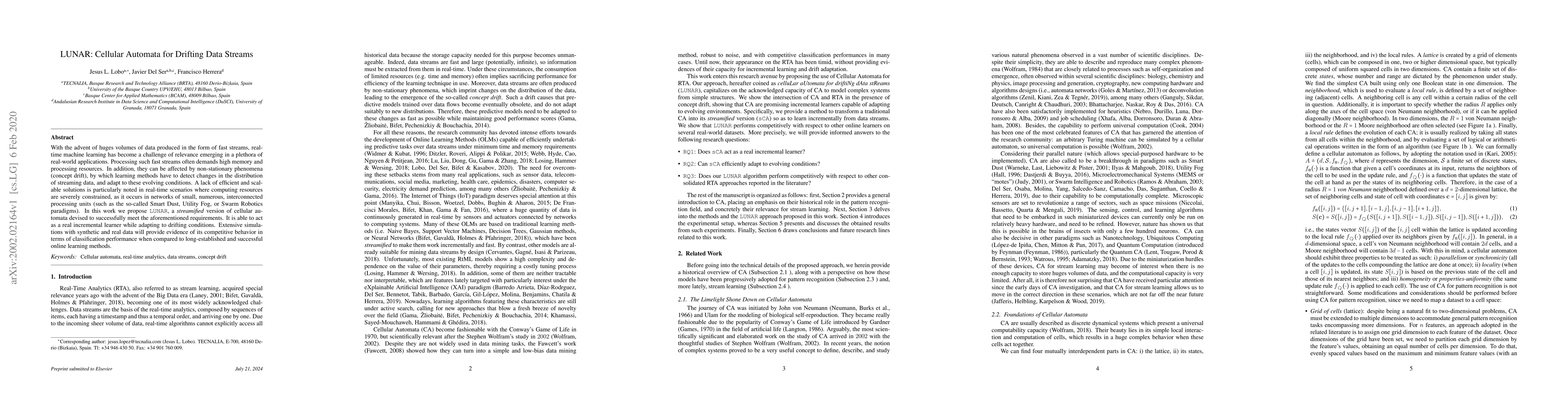 The paper proposes LUNAR, a cellular automata-based approach for processing drifting data streams in real-time, aiming to efficiently handle concept drift and resource constraints in scenarios like Smart Dust or Swarm Robotics. The method demonstrates competitive classification performance compared to traditional online learning methods through extensive simulations.