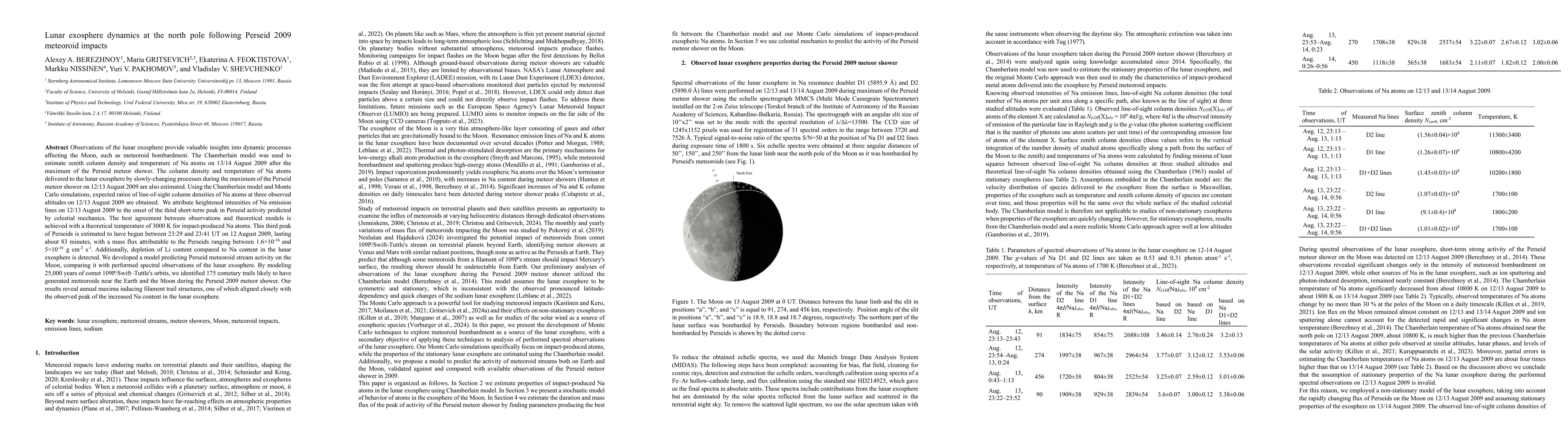 Observations of the lunar exosphere provide valuable insights into dynamic processes affecting the Moon, such as meteoroid bombardment. The Chamberlain model was employed to estimate the zenith column density and temperature of Na atoms on August 13/14, 2009, after the peak of the Perseid meteor shower. Additionally, the column density and temperature of Na atoms delivered to the lunar exosphere by gradual processes during the peak on August 12/13, 2009, were estimated. Expected ratios of line-of-sight column densities of Na atoms at three observed altitudes on August 12/13, 2009, were obtained using the Chamberlain model and Monte Carlo simulations. The heightened intensities of Na emission lines on August 12/13, 2009, are attributed to the onset of the third short-term peak in Perseid activity predicted by celestial mechanics. The best agreement between observations and theoretical models was achieved with a theoretical temperature of 3000 K for impact-produced Na atoms. This third peak of Perseids began between 23:29 and 23:41 UT on August 12, 2009, lasting approximately 83 minutes, with a mass flux attributed to the Perseids ranging between 1.6 x 10^-16 and 5 x 10^-16 g cm^-2 s^-1. Additionally, depletion of Li content compared to Na content in the lunar exosphere was detected. A model predicting Perseid meteoroid stream activity on the Moon was developed and compared with spectral observations of the lunar exosphere. By modeling 25,000 years of comet 109P/Swift-Tuttle's orbits, 175 cometary trails likely to have generated meteoroids near Earth and the Moon during the Perseid 2009 meteor shower were identified. Our results reveal annual maxima inducing filament trail structures, one of which closely aligned with the observed peak of increased Na content in the lunar exosphere.
