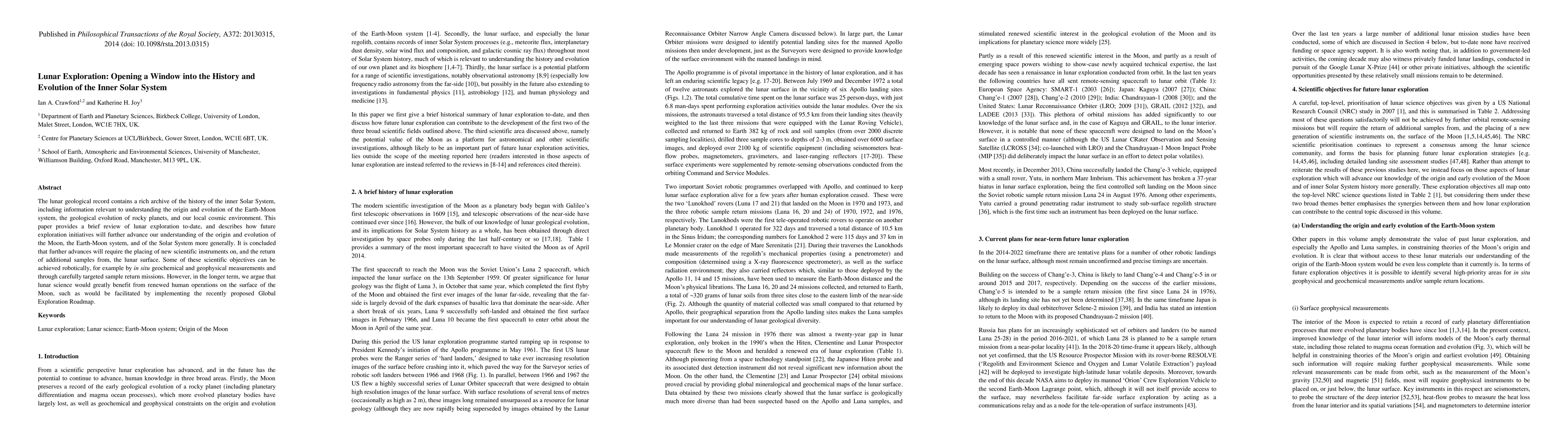 This paper reviews lunar exploration's role in understanding the inner Solar System's history and argues that future initiatives, including robotic missions and human operations, are essential for advancing knowledge of the Moon, Earth-Moon system, and broader Solar System evolution.
