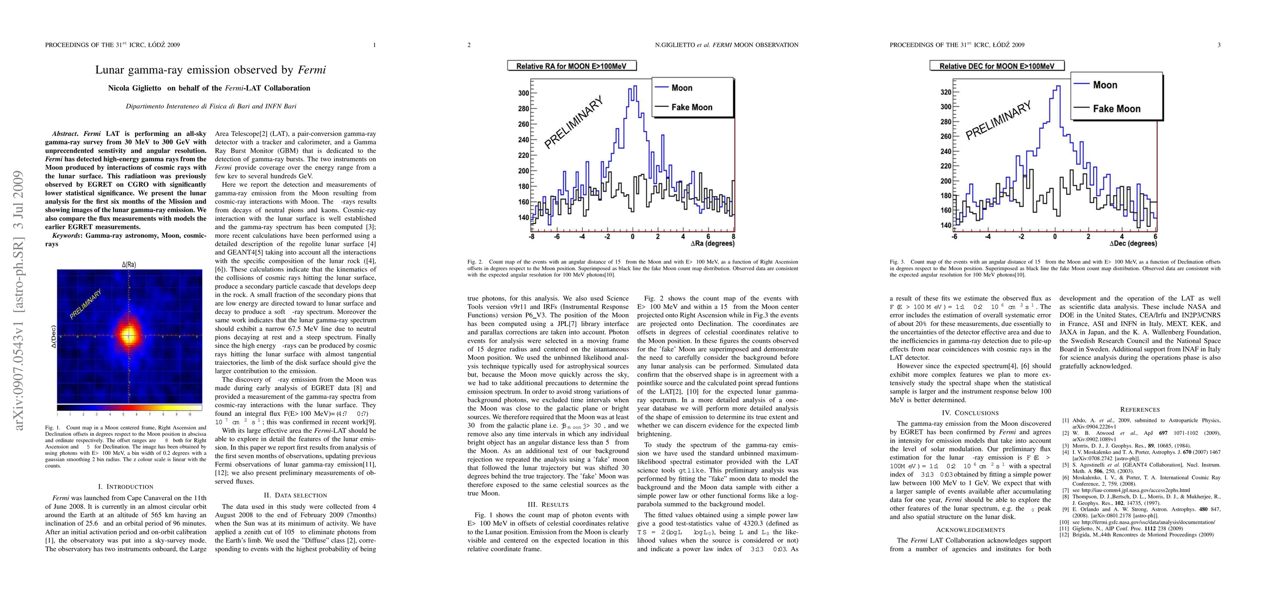 FERMI-LAT is performing an all-sky gamma-ray survey from 30 MeV to 300 GeV with unprecedented sensitivity and angular resolution. FERMI has detected high-energy gamma rays from the Moon produced by interactions of cosmic rays with the lunar surface. This radiation was previously observed by EGRET on CGRO with significantly lower statistical significance. We present the lunar analysis for the first six months of the Mission and showing images of the lunar gamma-ray emission. We also compare the flux measurements with models the earlier EGRET measurements.