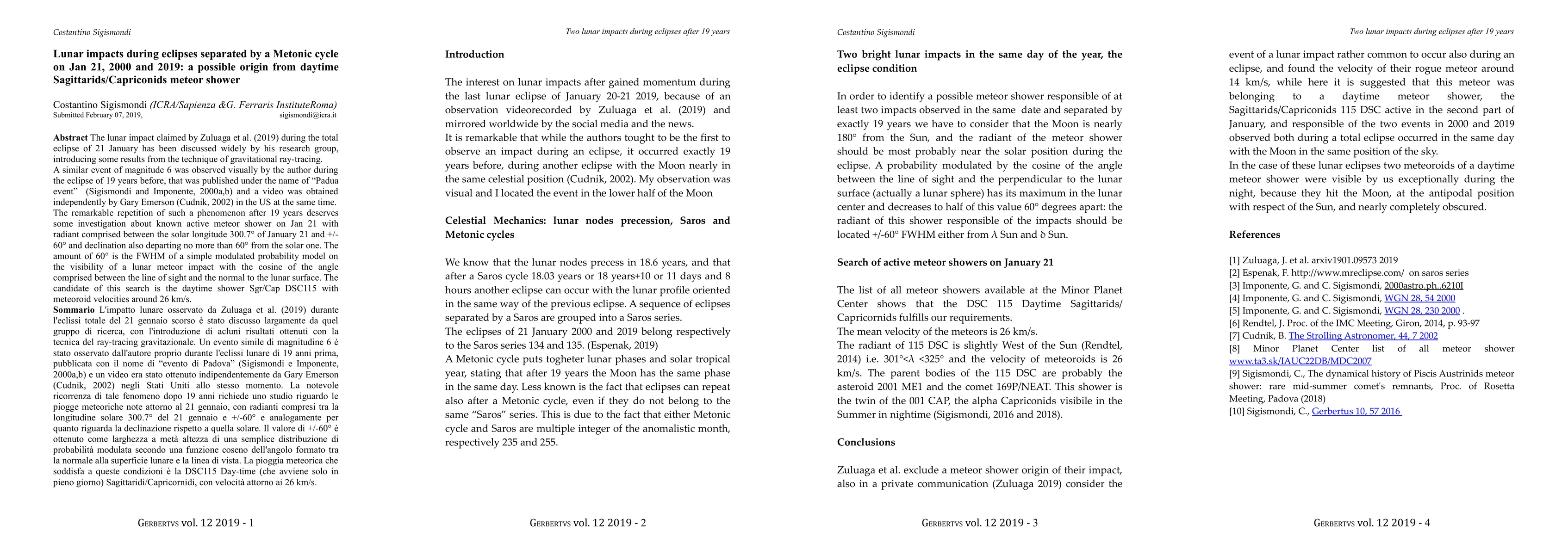The lunar impact claimed by Zuluaga et al. (2019) during the total eclipse of 21 January has been discussed widely by his research group, introducing some results from the technique of gravitational ray-tracing. A similar event of magnitude 6 was observed visually by the author during the eclipse of 19 years before, that was published under the name of Padua event (Sigismondi and Imponente, 2000a,b) and a video was obtained independently by Gary Emerson (Cudnik, 2002) in the US at the same time. The remarkable repetition of such a phenomenon after 19 years deserves some investigation about known active meteor shower on Jan 21 with radiant comprised between the solar longitude 300.7 degrees of January 21 and +/- 60 degrees and declination also departing no more than 60 degrees from the solar one. The amount of 60 degrees is the FWHM of a simple modulated probability model on the visibility of a lunar meteor impact with the cosine of the angle comprised between the line of sight and the normal to the lunar surface. The candidate of this search is the daytime shower Sgr/Cap DSC115 with meteoroid velocities around 26 km/s.