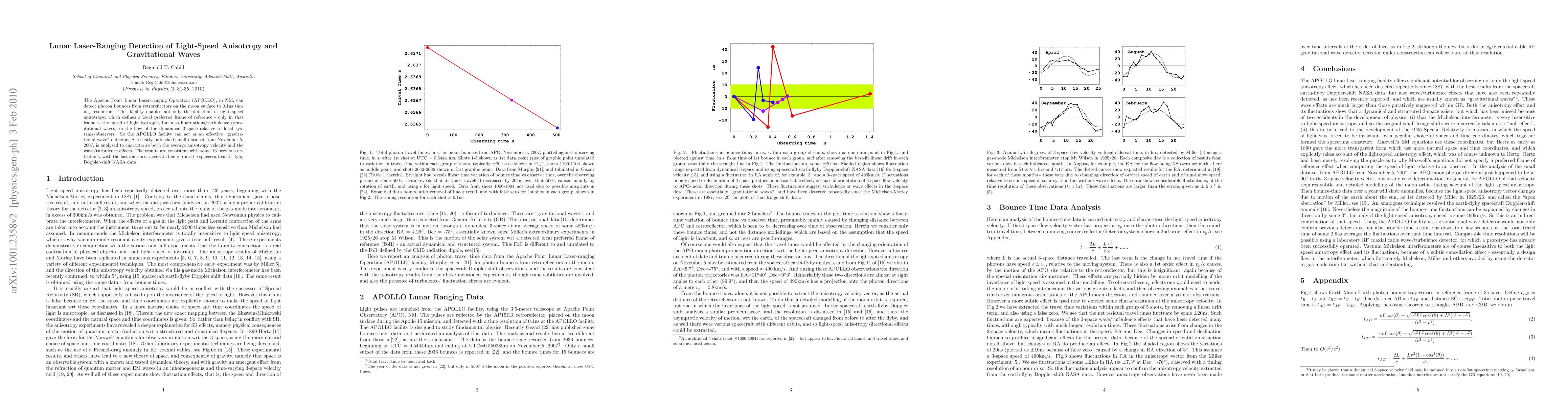 The Apache Point Lunar Laser-ranging Operation (APOLLO) detects light speed anisotropy and gravitational wave fluctuations using precise lunar retro-reflector bounces. Analysis of a 2007 data set confirms these phenomena, aligning with previous detections.