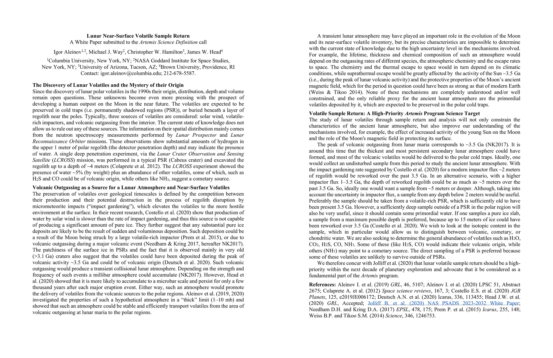 This paper argues that lunar volatiles from volcanic outgassing could provide insights into the Moon's ancient atmosphere and its evolution. It advocates for a sample return mission from the Moon's polar cold traps to study these primordial volatiles as part of the Artemis program.