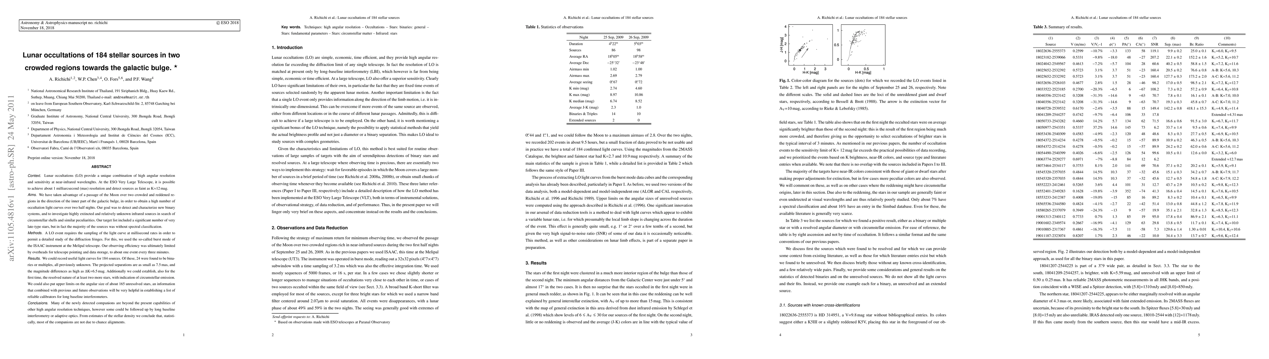 Lunar occultations (LO) provide a unique combination of high angular resolution and sensitivity at near-infrared wavelenghts. At the ESO Very Large Telescope, it is possible to achieve about 1 milliarcsecond (mas) resolution and detect sources as faint as K$\approx$12\,mag. We have taken advantage of a passage of the Moon over two crowded and reddened regions in the direction of the inner part of the galactic bulge, in order to obtain a high number of occultation light curves over two half nights. Our goal was to detect and characterize new binary systems, and to investigate highly extincted and relatively unknown infrared sources in search of circumstellar shells and similar peculiarities. Our target list included a significant number of very late-type stars, but in fact the majority of the sources was without spectral classification. A LO event requires the sampling of the light curve at millisecond rates in order to permit a detailed study of the diffraction fringes. For this, we used the so-called burst mode of the ISAAC instrument at the Melipal telescope. Our observing efficiency was ultimately limited by overheads for telescope pointing and data storage, to about one event every three minutes. We could record useful light curves for 184 sources. Of these, 24 were found to be binaries or multiples, all previously unknown. The projected separations are as small as 7.5\,mas, and the magnitude differences as high as $\Delta$K=6.5\,mag. Additionally we could establish, also for the first time, the resolved nature of at least two more stars, with indication of circumstellar emission. We could also put upper limits on the angular size of about 165 unresolved stars, an information that combined with previous and future observations will be very helpful in establishing a list of reliable calibrators for long baseline interferometers.