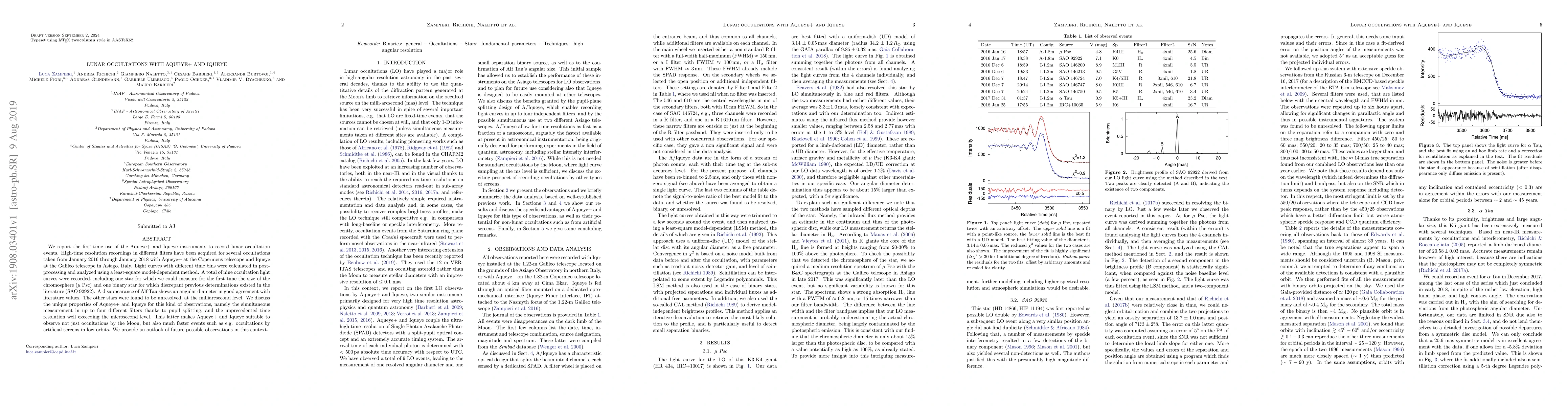 We report the first-time use of the Aqueye+ and Iqueye instruments to record lunar occultation events. High-time resolution recordings in different filters have been acquired for several occultations taken from January 2016 through January 2018 with Aqueye+ at the Copernicus telescope and Iqueye at the Galileo telescope in Asiago, Italy. Light curves with different time bins were calculated in post-processing and analyzed using a least-square model-dependent method. A total of nine occultation light curves were recorded, including one star for which we could measure for the first time the size of the chromosphere ($\mu$ Psc) and one binary star for which discrepant previous determinations existed in the literature (SAO 92922). A disappearance of Alf Tau shows an angular diameter in good agreement with literature values. The other stars were found to be unresolved, at the milliarcsecond level. We discuss the unique properties of Aqueye+ and Iqueye for this kind of observations, namely the simultaneous measurement in up to four different filters thanks to pupil splitting, and the unprecedented time resolution well exceeding the microsecond level. This latter makes Aqueye+ and Iqueye suitable to observe not just occultations by the Moon, but also much faster events such as e.g. occultations by artificial screens in low orbits. We provide an outlook of future possible observations in this context.