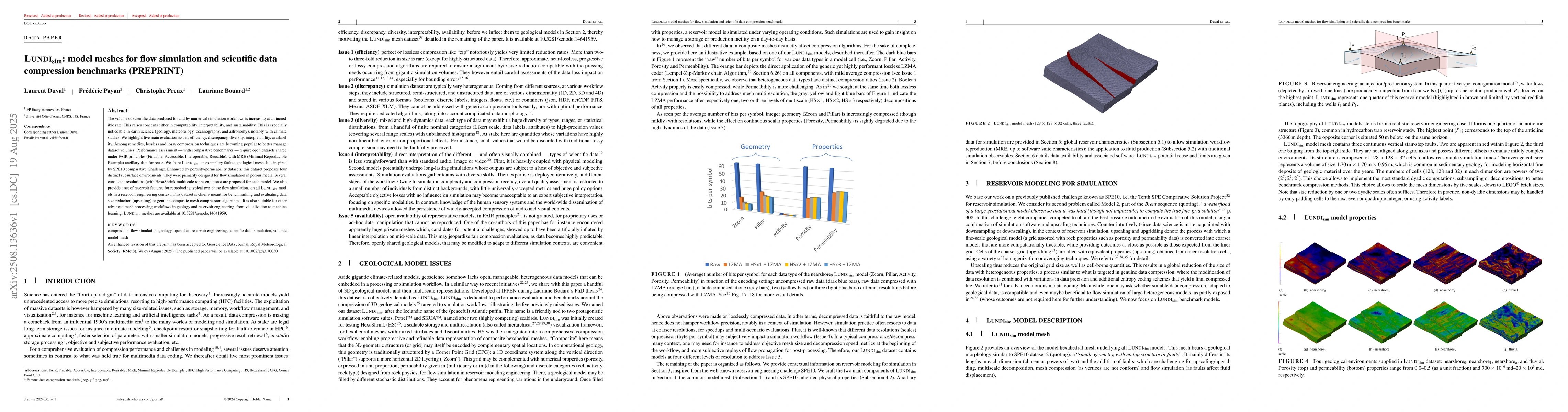 The volume of scientific data produced for and by numerical simulation workflows is increasing at an incredible rate. This raises concerns either in computability, interpretability, and sustainability. This is especially noticeable in earth science (geology, meteorology, oceanography, and astronomy), notably with climate studies. We highlight five main evaluation issues: efficiency, discrepancy, diversity, interpretability, availability. Among remedies, lossless and lossy compression techniques are becoming popular to better manage dataset volumes. Performance assessment -- with comparative benchmarks -- require open datasets shared under FAIR principles (Findable, Accessible, Interoperable, Reusable), with MRE (Minimal Reproducible Example) ancillary data for reuse. We share LUNDIsim, an exemplary faulted geological mesh. It is inspired by SPE10 comparative Challenge. Enhanced by porosity/permeability datasets, this dataset proposes four distinct subsurface environments. They were primarily designed for flow simulation in porous media. Several consistent resolutions (with HexaShrink multiscale representations) are proposed for each model. We also provide a set of reservoir features for reproducing typical two-phase flow simulations on all LUNDIsim models in a reservoir engineering context. This dataset is chiefly meant for benchmarking and evaluating data size reduction (upscaling) or genuine composite mesh compression algorithms. It is also suitable for other advanced mesh processing workflows in geology and reservoir engineering, from visualization to machine learning. LUNDIsim meshes are available at https://doi.org/10.5281/zenodo.14641958