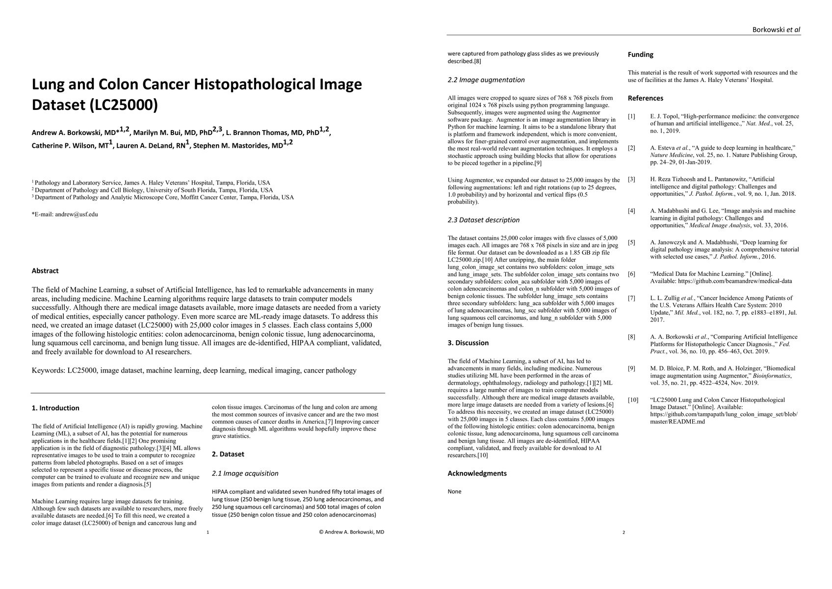 This paper introduces the LC25000 dataset, comprising 25,000 de-identified, HIPAA-compliant histopathological images of lung and colon cancer, including adenocarcinomas and benign tissues. The dataset aims to support advancements in machine learning-based medical diagnostics.