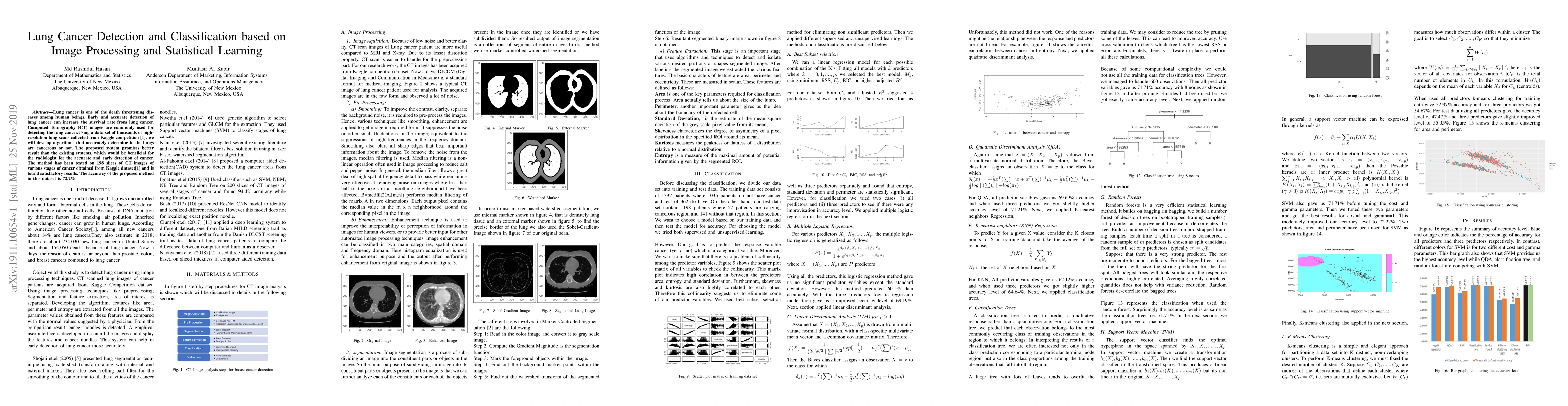 This research develops algorithms for lung cancer detection using CT image processing and statistical learning, achieving 72.2% accuracy on a Kaggle dataset. The proposed method aims to improve early and accurate detection, aiding radiologists in identifying cancerous tissues.
