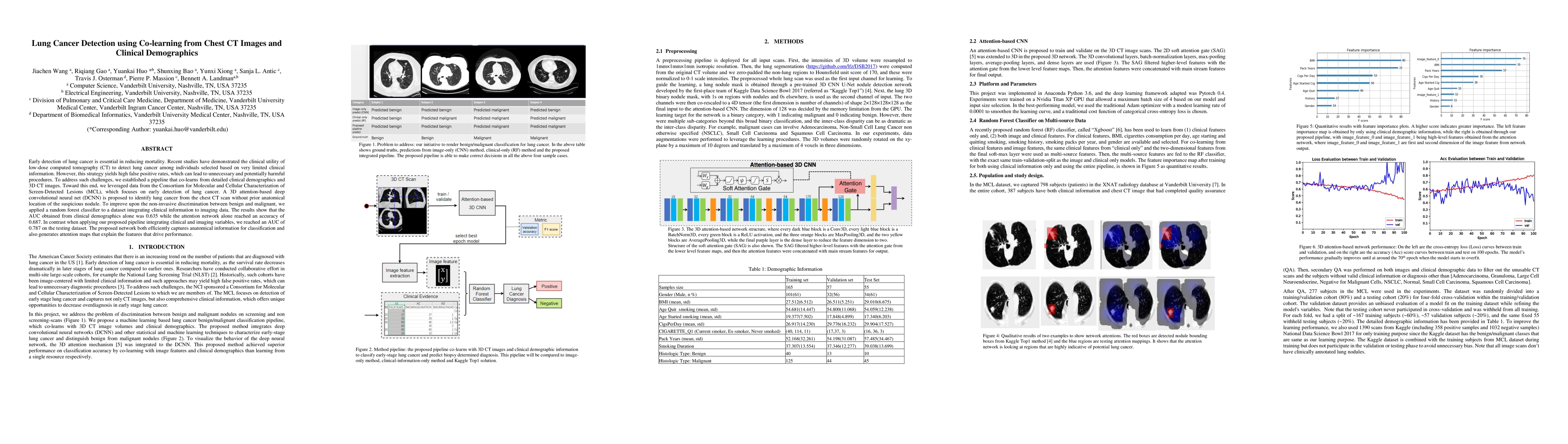 Early detection of lung cancer is essential in reducing mortality. Recent studies have demonstrated the clinical utility of low-dose computed tomography (CT) to detect lung cancer among individuals selected based on very limited clinical information. However, this strategy yields high false positive rates, which can lead to unnecessary and potentially harmful procedures. To address such challenges, we established a pipeline that co-learns from detailed clinical demographics and 3D CT images. Toward this end, we leveraged data from the Consortium for Molecular and Cellular Characterization of Screen-Detected Lesions (MCL), which focuses on early detection of lung cancer. A 3D attention-based deep convolutional neural net (DCNN) is proposed to identify lung cancer from the chest CT scan without prior anatomical location of the suspicious nodule. To improve upon the non-invasive discrimination between benign and malignant, we applied a random forest classifier to a dataset integrating clinical information to imaging data. The results show that the AUC obtained from clinical demographics alone was 0.635 while the attention network alone reached an accuracy of 0.687. In contrast when applying our proposed pipeline integrating clinical and imaging variables, we reached an AUC of 0.787 on the testing dataset. The proposed network both efficiently captures anatomical information for classification and also generates attention maps that explain the features that drive performance.