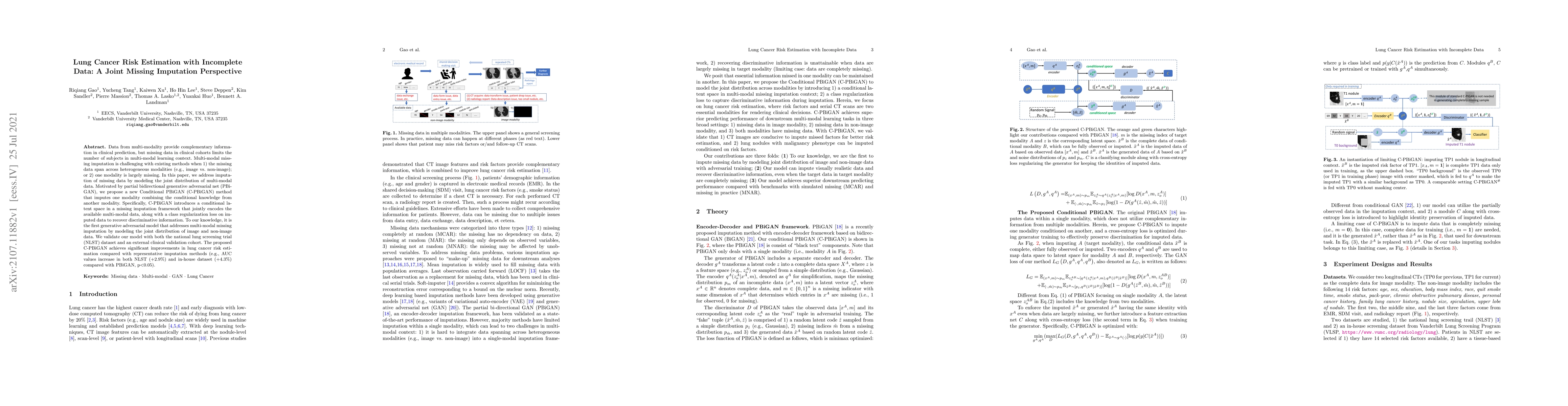 This paper proposes a Conditional Partial Bidirectional Generative Adversarial Network (C-PBiGAN) for imputing missing multi-modal data in lung cancer risk estimation, achieving significant improvements in AUC values compared to existing methods. The model leverages conditional latent space and class regularization to handle heterogeneous missing data across modalities.