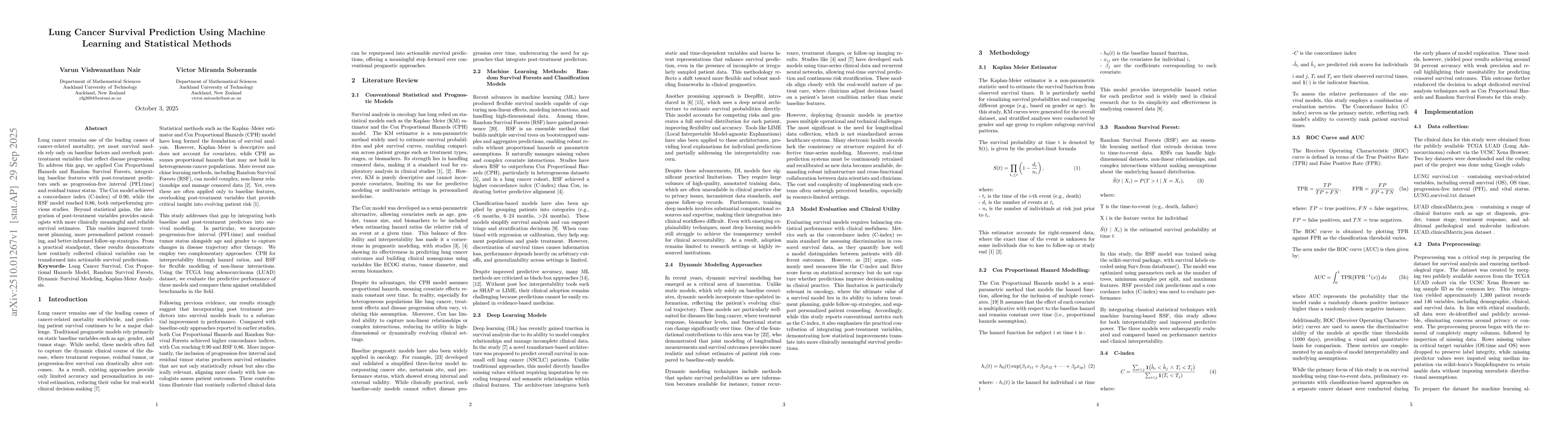 The study combined Cox Proportional Hazards and Random Survival Forests (RSF) models to predict lung cancer survival. It integrated baseline clinical data with post-treatment variables like progression-free interval (PFI.time) and residual tumor status. Kaplan-Meier estimators were used for survival analysis, and the C-index was employed to evaluate model performance.