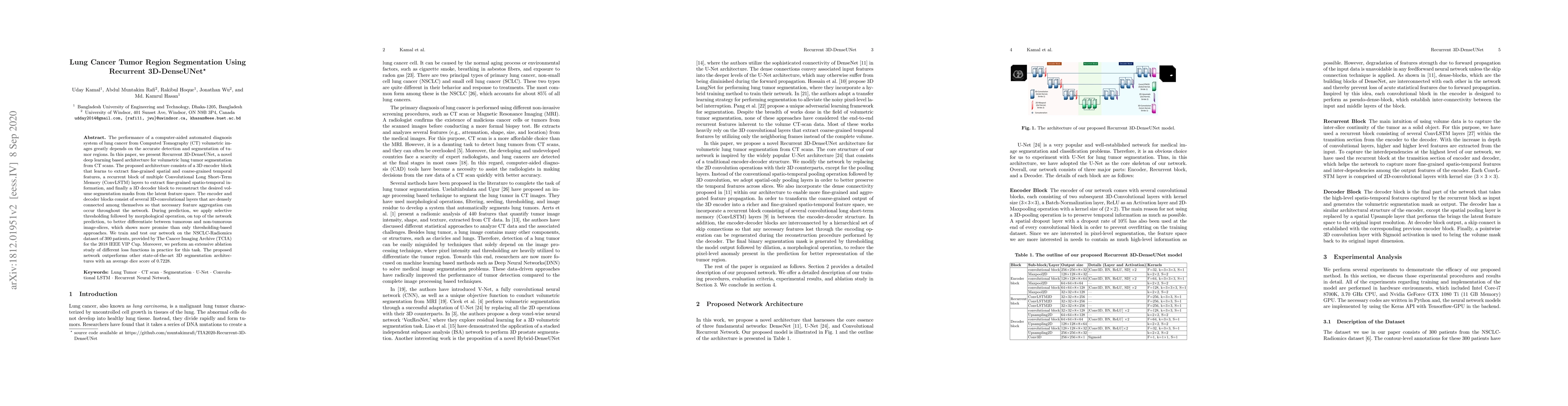 This paper introduces Recurrent 3D-DenseUNet, a deep learning model for segmenting lung tumor regions in CT scans, achieving superior performance with an average Dice score of 0.7228. The architecture combines 3D encoder-decoder blocks with ConvLSTM layers to extract and reconstruct fine-grained spatial and temporal features for accurate tumor segmentation.