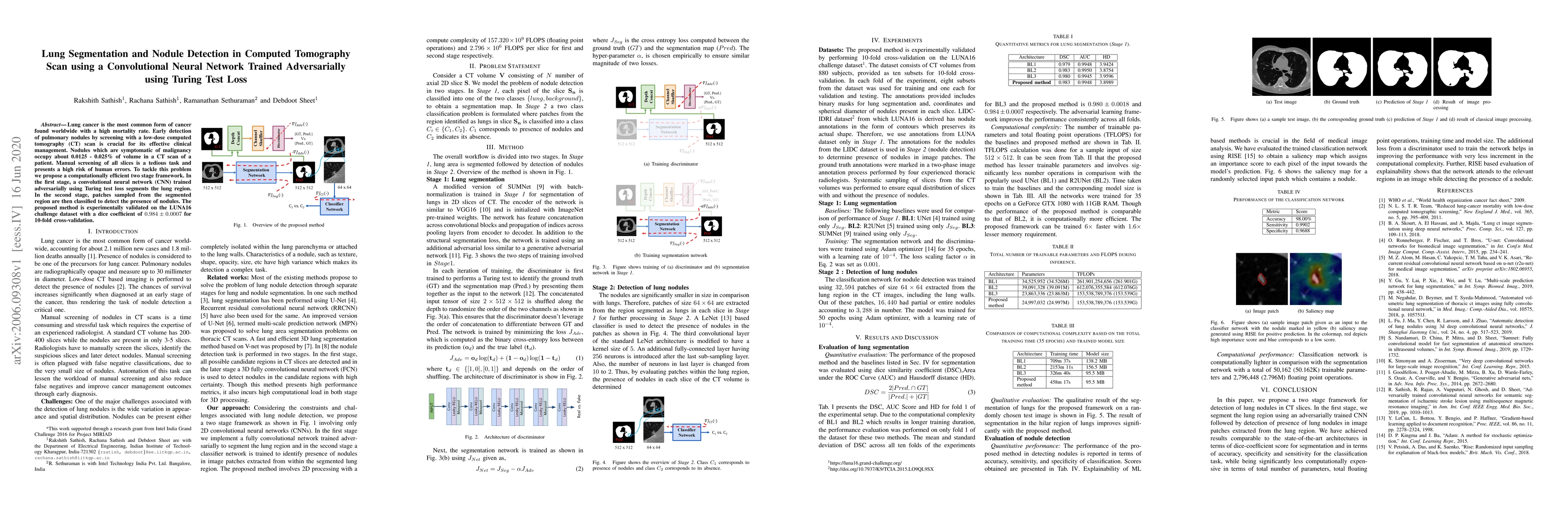 This paper proposes a two-stage framework for lung segmentation and nodule detection in CT scans using a convolutional neural network (CNN) trained with adversarial Turing test loss. The method segments lung regions in the first stage and detects nodules in the second stage, achieving a high dice coefficient of 0.984±0.0007 on the LUNA16 dataset.