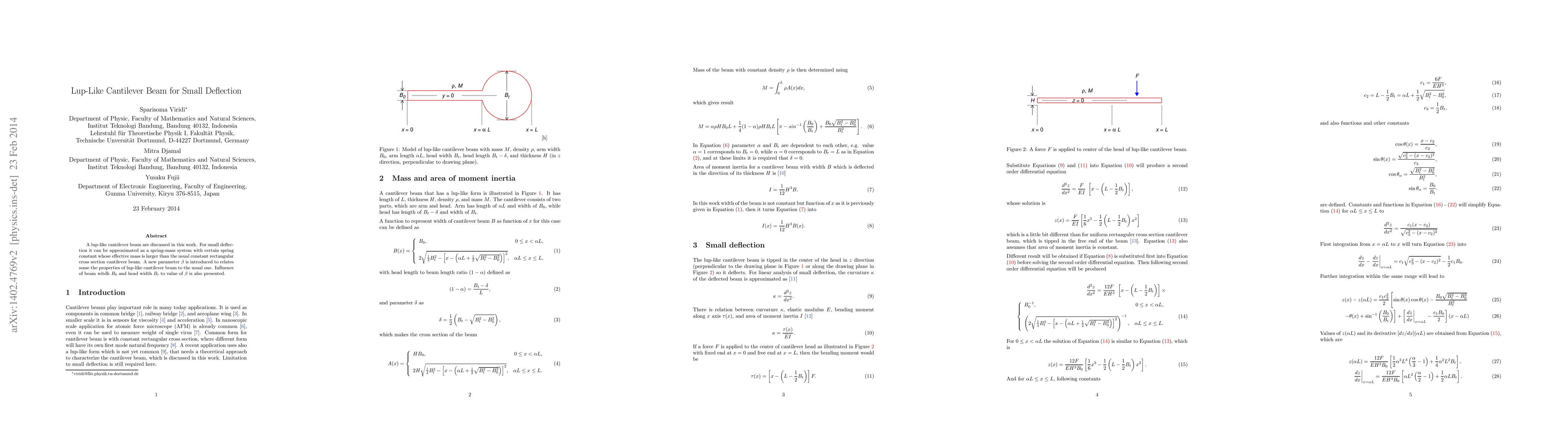 This paper investigates the lup-like cantilever beam, approximating it as a spring-mass system with a larger effective mass than typical rectangular beams. A new parameter $\beta$ is introduced to relate its properties to standard beams, with analysis on the influence of beam width $B_0$ and head width $B_t$ on $\beta$.