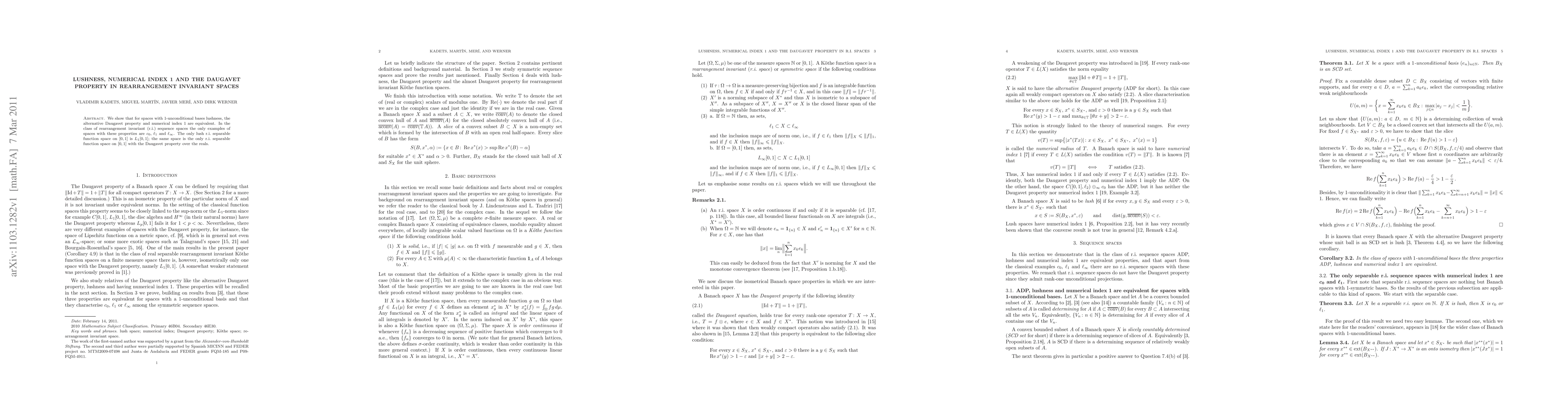 This paper demonstrates that in rearrangement invariant spaces with 1-unconditional bases, lushness, the Daugavet property, and numerical index 1 are equivalent. The only r.i. sequence spaces with these properties are $c_0$, $\ell_1$, and $\ell_\infty$, and $L_1[0,1]$ is the sole lush r.i. separable function space on $[0,1]$ with the Daugavet property over the reals.