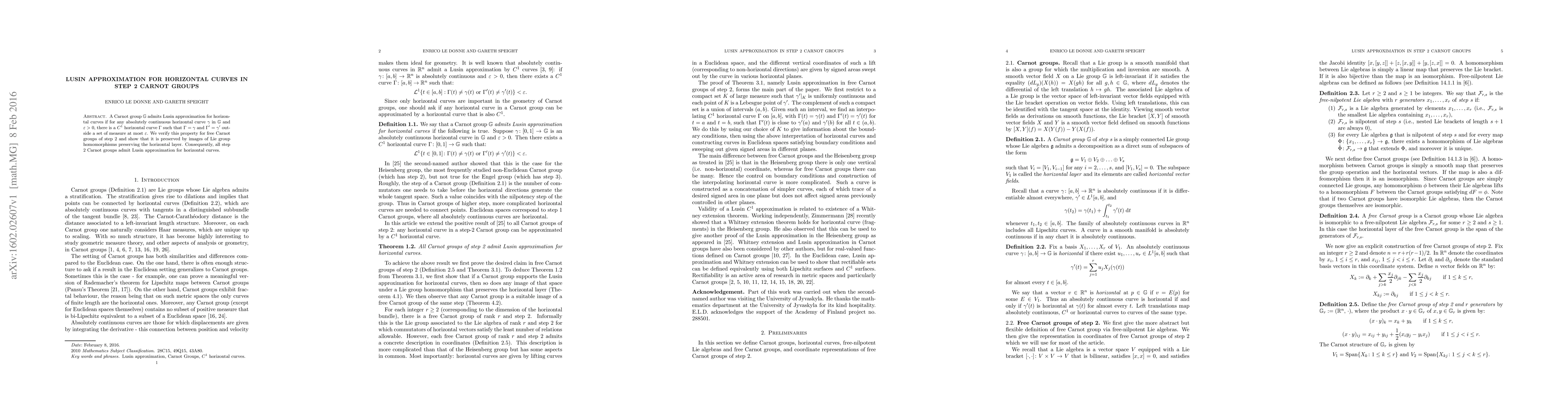 This paper verifies that free Carnot groups of step 2 admit Lusin approximation for horizontal curves, meaning that any absolutely continuous horizontal curve can be approximated by a $C^1$ curve outside a small set. It also shows that this property is preserved under Lie group homomorphisms that maintain the horizontal layer.