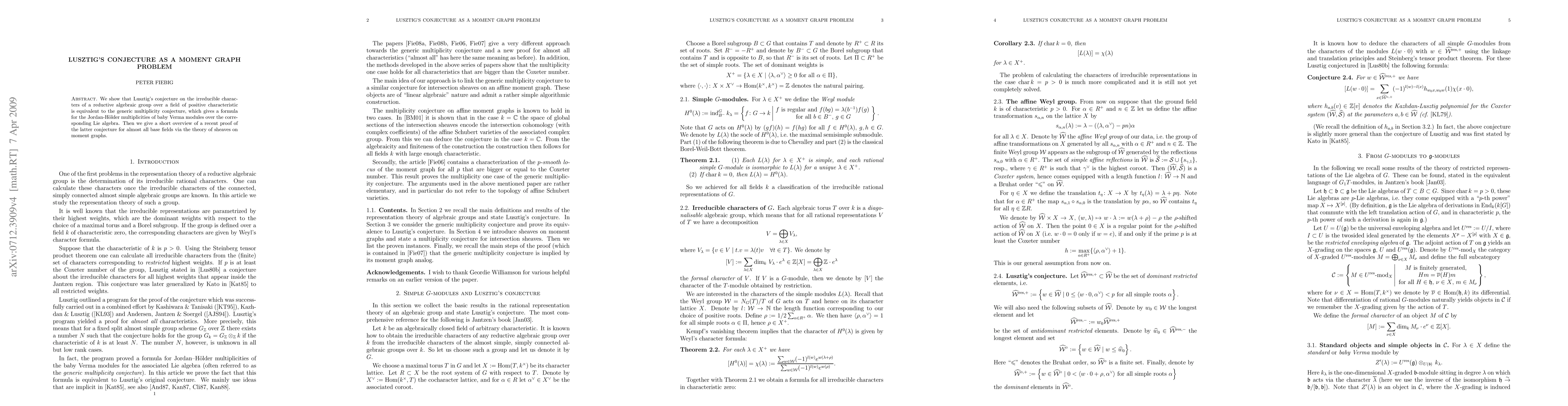 We show that Lusztig's conjecture on the irreducible characters of a reductive algebraic group over a field of positive characteristic is equivalent to the generic multiplicity conjecture, which gives a formula for the Jordan-H"older multiplicities of baby Verma modules over the corresponding Lie algebra. Then we give a short overview of a recent proof of the latter conjecture for almost all base fields via the theory of sheaves on moment graphs.