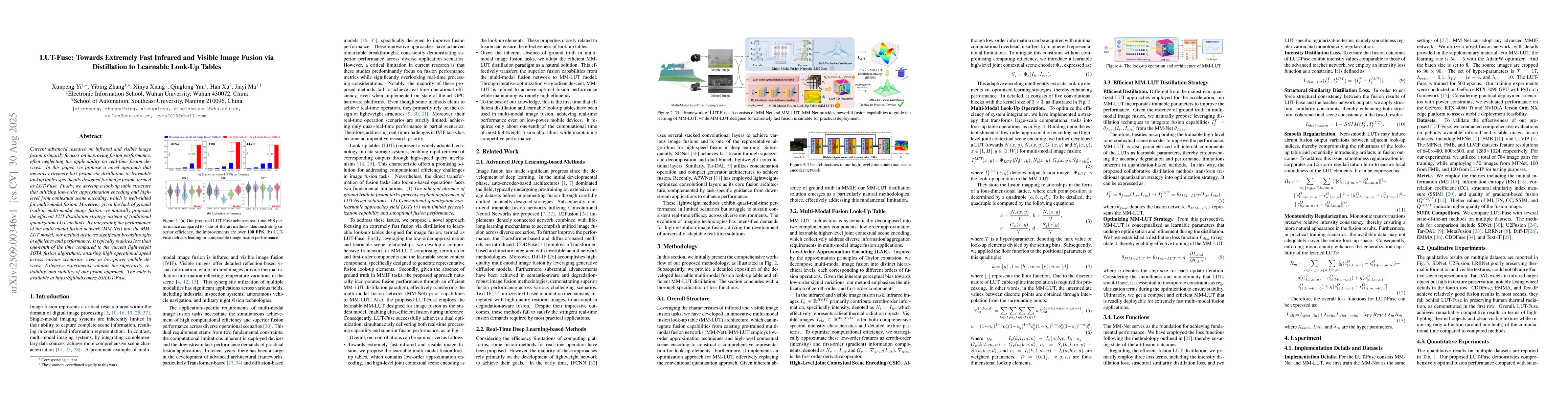 Current advanced research on infrared and visible image fusion primarily focuses on improving fusion performance, often neglecting the applicability on real-time fusion devices. In this paper, we propose a novel approach that towards extremely fast fusion via distillation to learnable lookup tables specifically designed for image fusion, termed as LUT-Fuse. Firstly, we develop a look-up table structure that utilizing low-order approximation encoding and high-level joint contextual scene encoding, which is well-suited for multi-modal fusion. Moreover, given the lack of ground truth in multi-modal image fusion, we naturally proposed the efficient LUT distillation strategy instead of traditional quantization LUT methods. By integrating the performance of the multi-modal fusion network (MM-Net) into the MM-LUT model, our method achieves significant breakthroughs in efficiency and performance. It typically requires less than one-tenth of the time compared to the current lightweight SOTA fusion algorithms, ensuring high operational speed across various scenarios, even in low-power mobile devices. Extensive experiments validate the superiority, reliability, and stability of our fusion approach. The code is available at https://github.com/zyb5/LUT-Fuse.